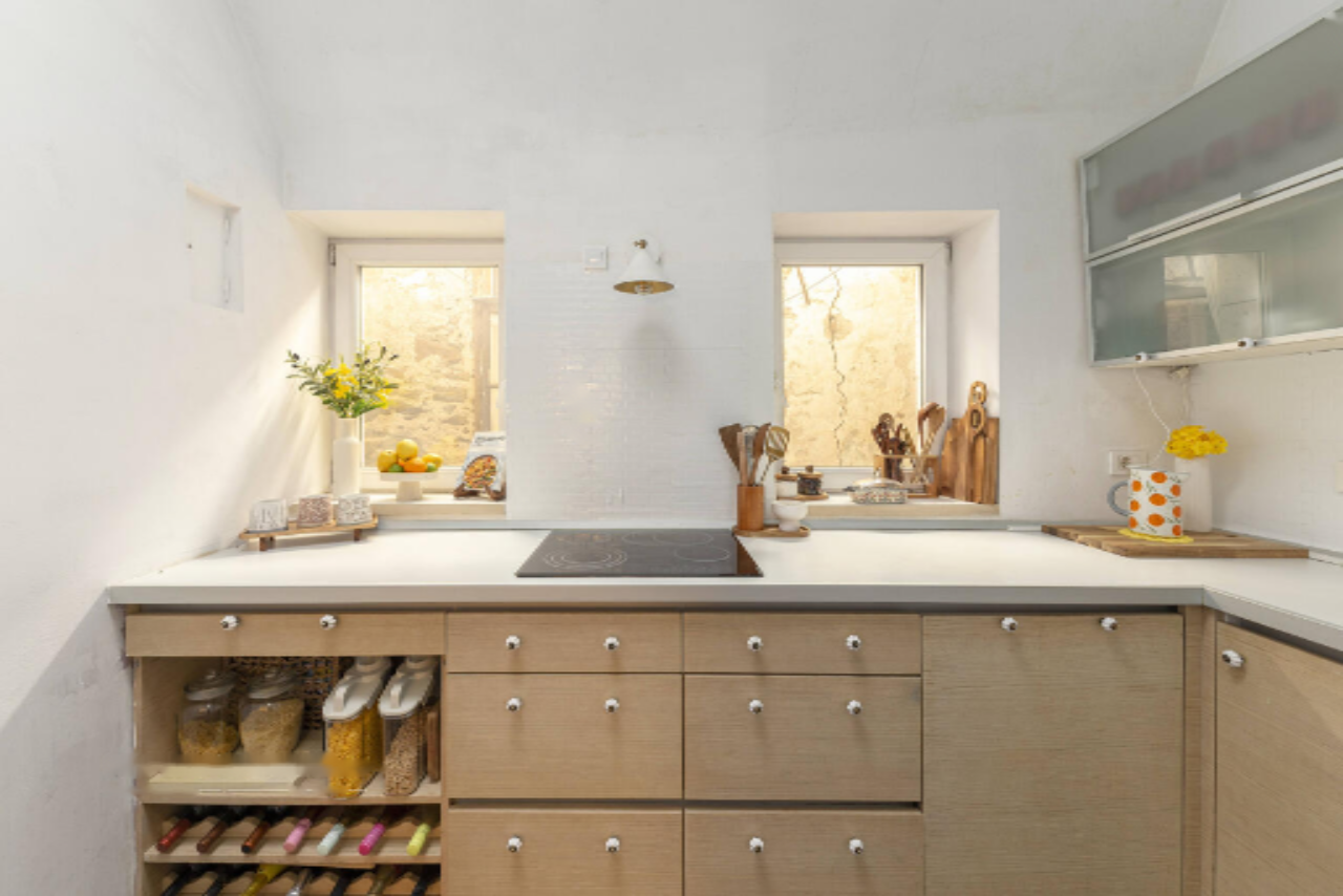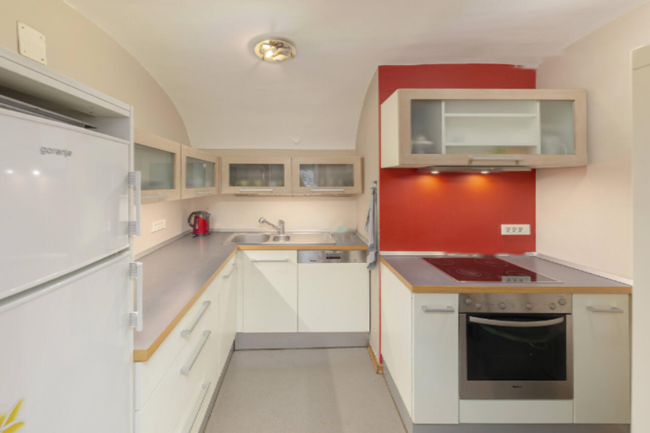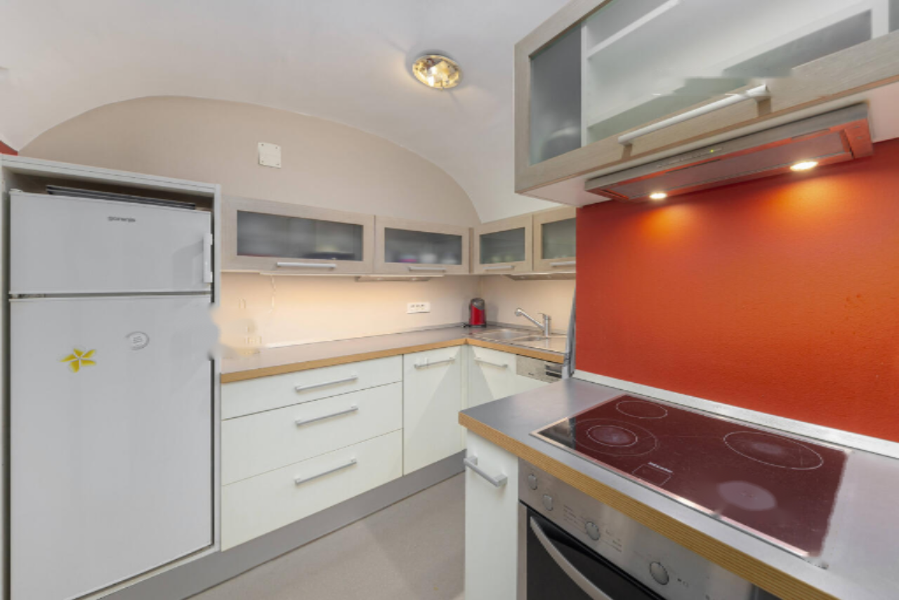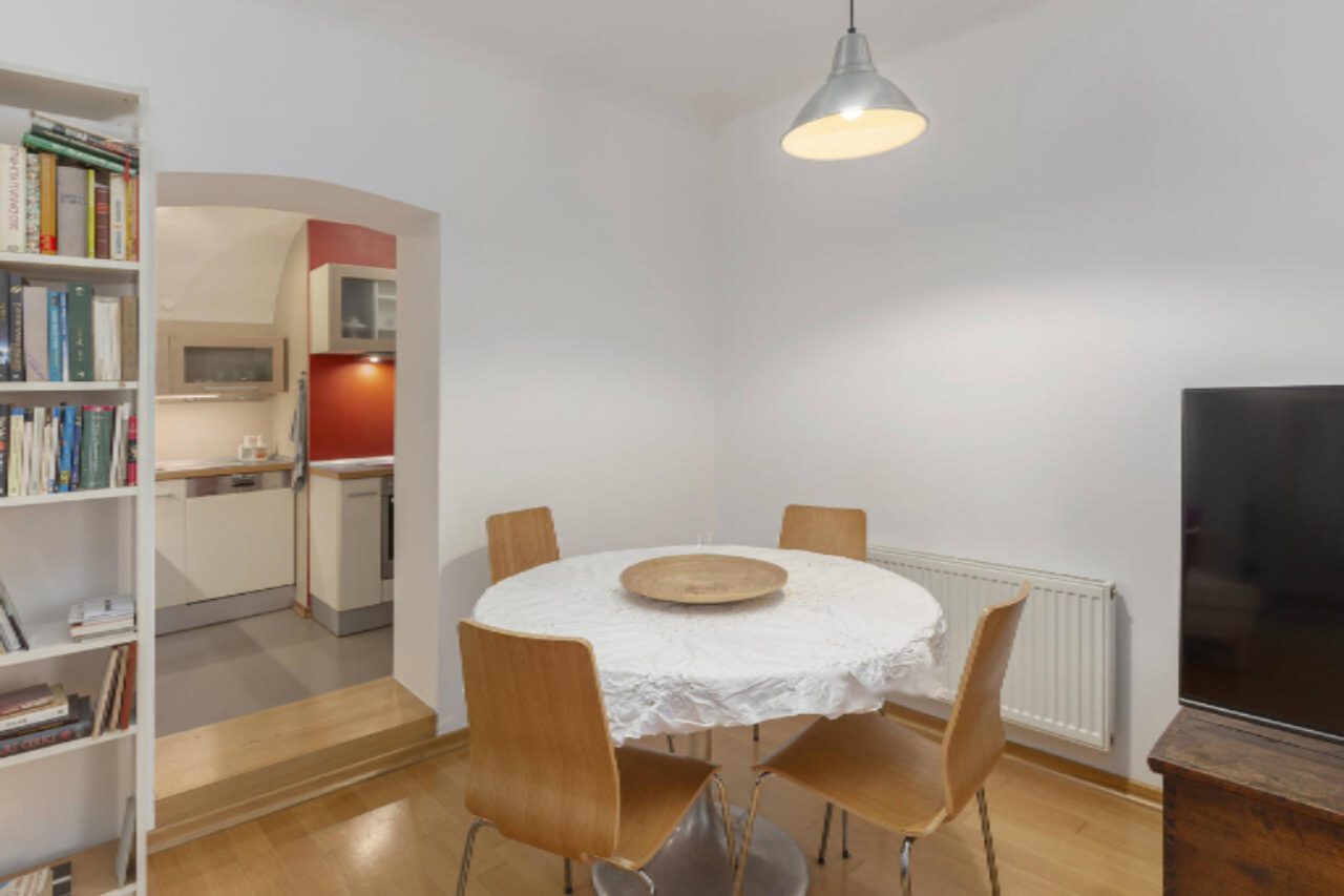 Меньшая часть квартиры площадью около 64 м² включает в себя прихожую, просторную кухню, большую гостиную с обеденной зоной, спальню с доступом к гардеробной, ванную комнату и кладовку. Из гостиной и спальни открывается великолепный вид на Горний Трг.