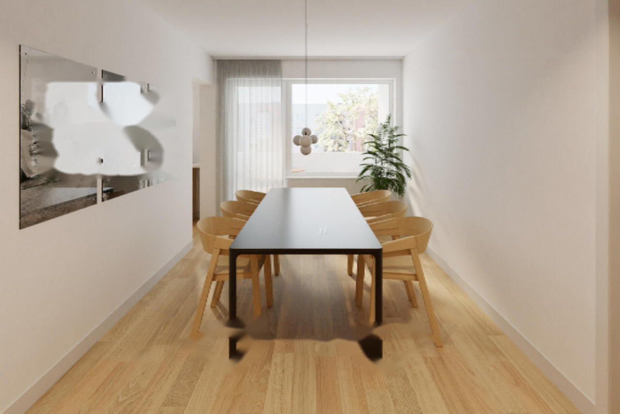 Квартира включает в себя прихожую, отдельный туалет, ванную комнату, две детские комнаты, родительскую спальню, а также кухню, совмещенную с обеденной зоной и гостиной. Из гостиной открывается выход на застекленный балкон площадью 3,7 м². В стоимость также входит кладовая в подвале площадью 1,5 м² и доступ к общим помещениям, включая велосипедную комнату. ♂️