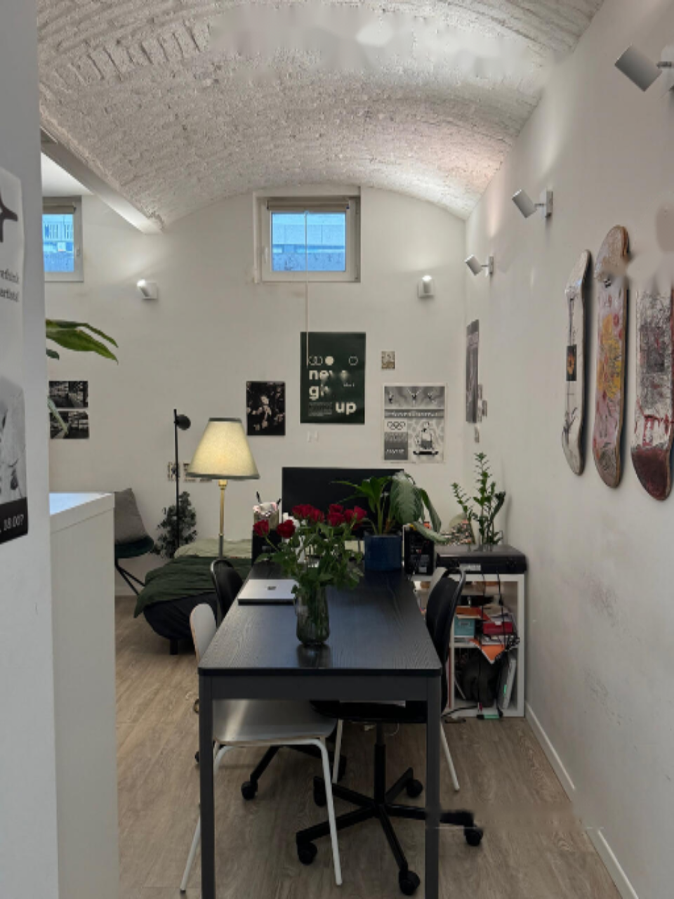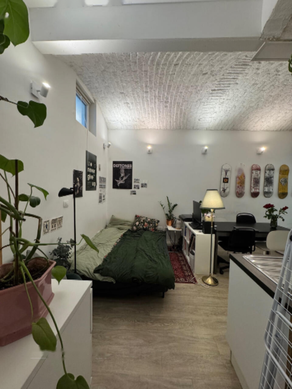 Студия поделена на прихожую, жилую зону с кухней, отдельную ванную комнату и небольшую кладовую. Продаётся полностью меблированной, включая бытовую технику. Парковка возможна на улице с разрешением или без него около железнодорожной линии.