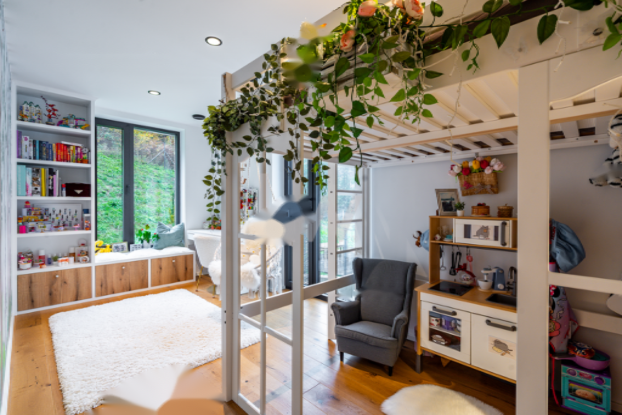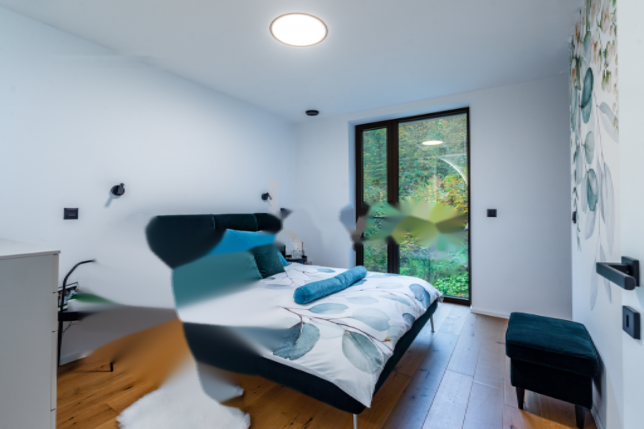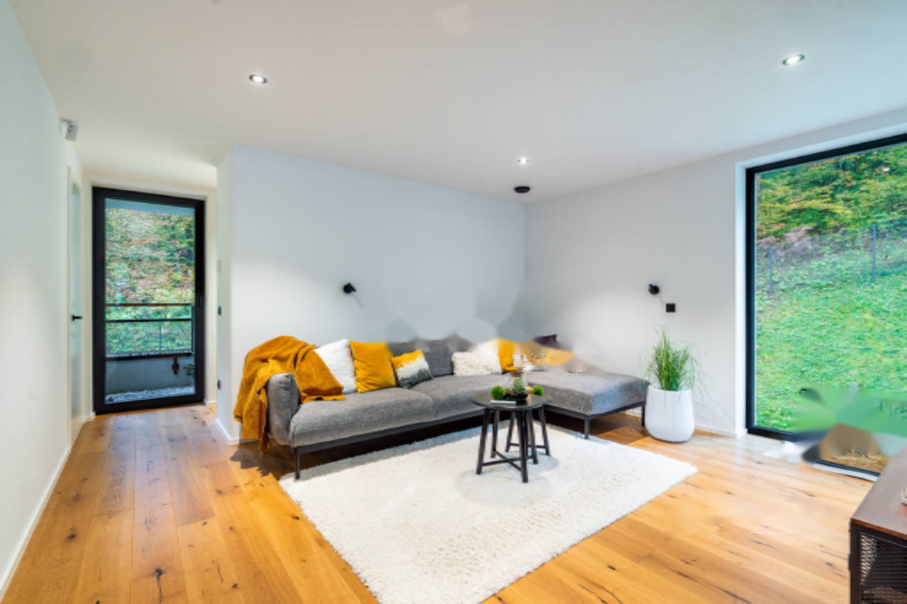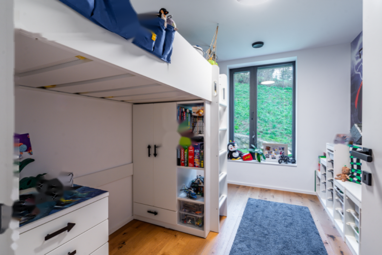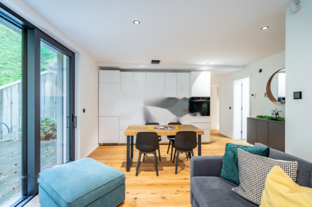Основное жилье включает четыре спальни и три ванные комнаты, что обеспечивает комфорт и приватность для всей семьи. Здесь также предусмотрен атриум, терраса и собственное парковочное место. Системы климат-контроля, такие как напольное отопление и кондиционирование воздуха, создают уют в любое время года.