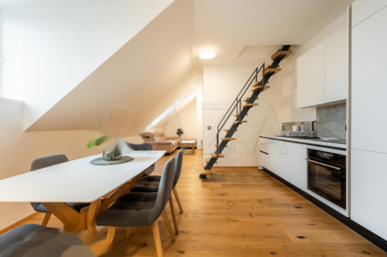 На третьем этаже располагаются ванная комната, открытая гостиная с кухней и столовой. На мансардном этаже находятся две спальни. Все помещения ориентированы на запад. Квартира полностью меблирована, и вся мебель входит в стоимость. Также она полностью оборудована для краткосрочной аренды через такие платформы, как Airbnb и Booking, что делает ее привлекательной инвестицией. В 2021 году были обновлены все инженерные сети, полы, изоляция и система кондиционирования. Отопление обеспечивается тепловым насосом.