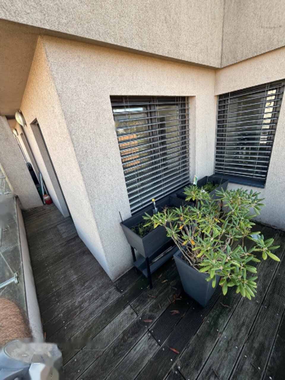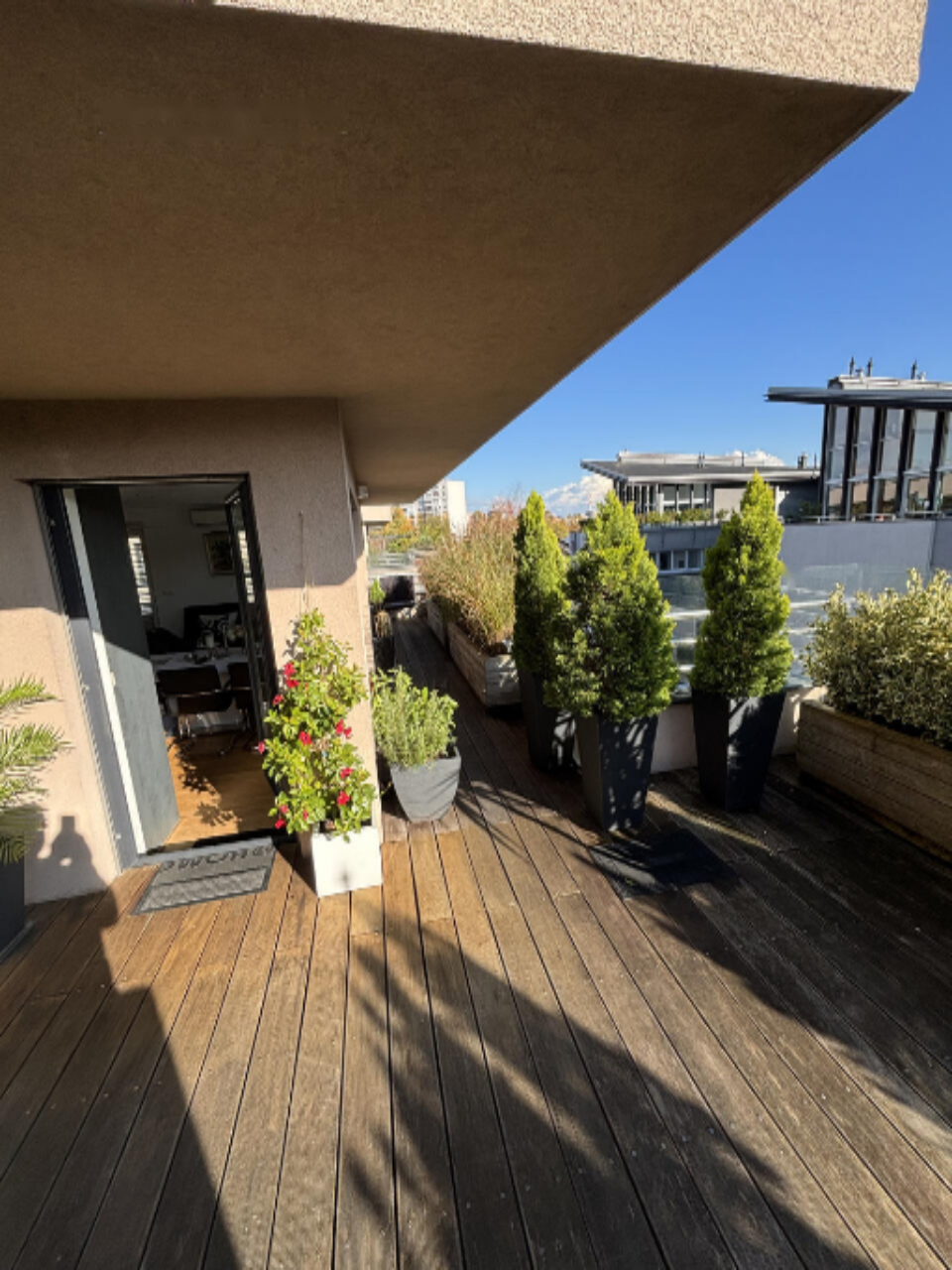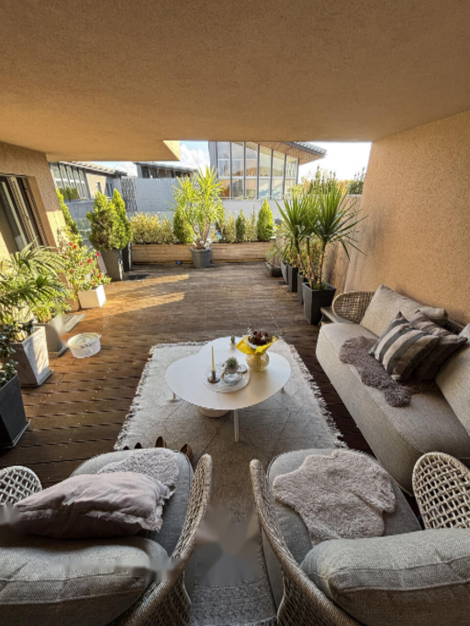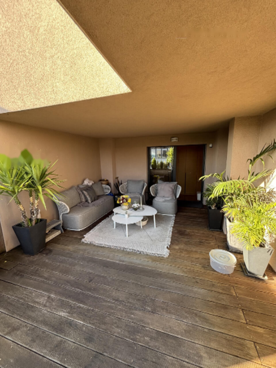 Главная терраса разделена на закрытую и открытую части. На закрытой части расположена комфортная сидячая зона, а на открытой части — два шезлонга. На террасе проведено электричество, что позволяет установить электрический гриль или летнюю кухню.