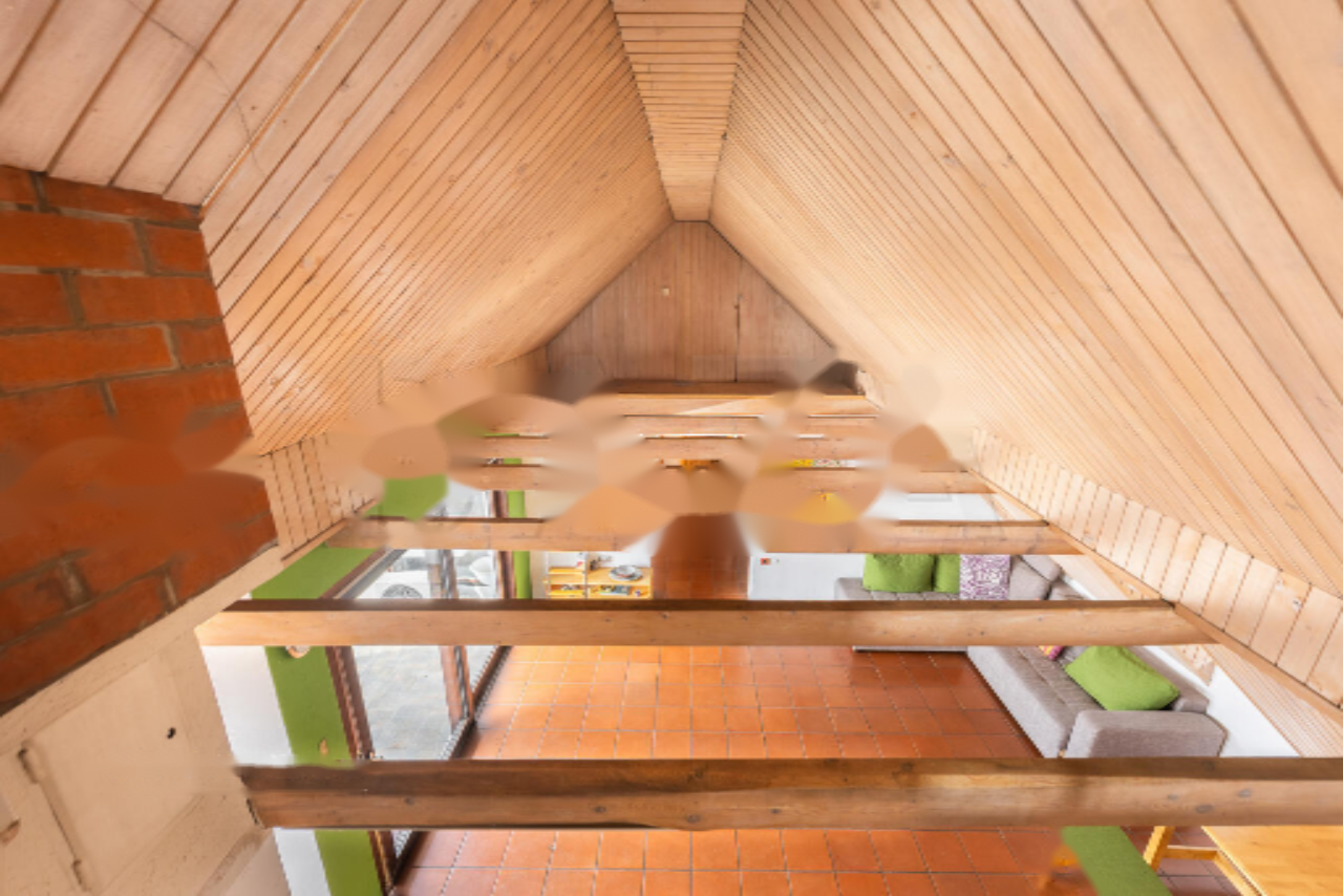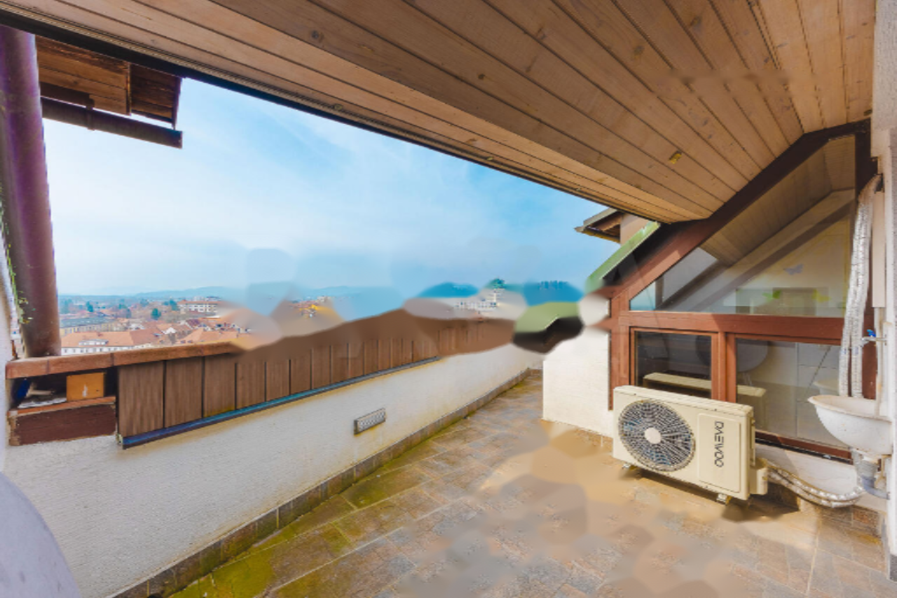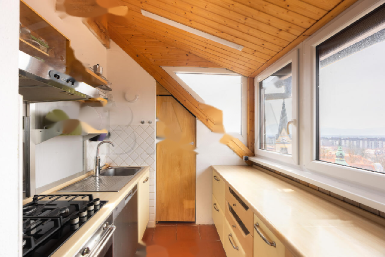 Просторная квартира площадью 132 м² занимает весь верхний этаж, с окнами, ориентированными на все стороны света, и великолепным видом на Любляну. Функциональная планировка включает лестницу с прихожей, кабинет, главную спальню с ванной комнатой и ванной, две детские комнаты с собственной ванной, кухню с кладовой, открытую гостиную с камином и балконом, ориентированным на запад. Над гостиной расположены балконные галереи, используемые как игровая и потолочная кладовая. В квартире также есть подсобное помещение на первом этаже и кладовая в подвале.