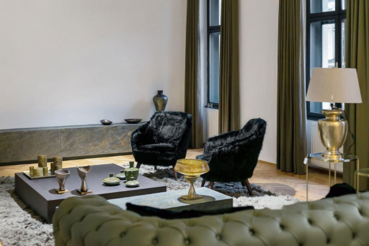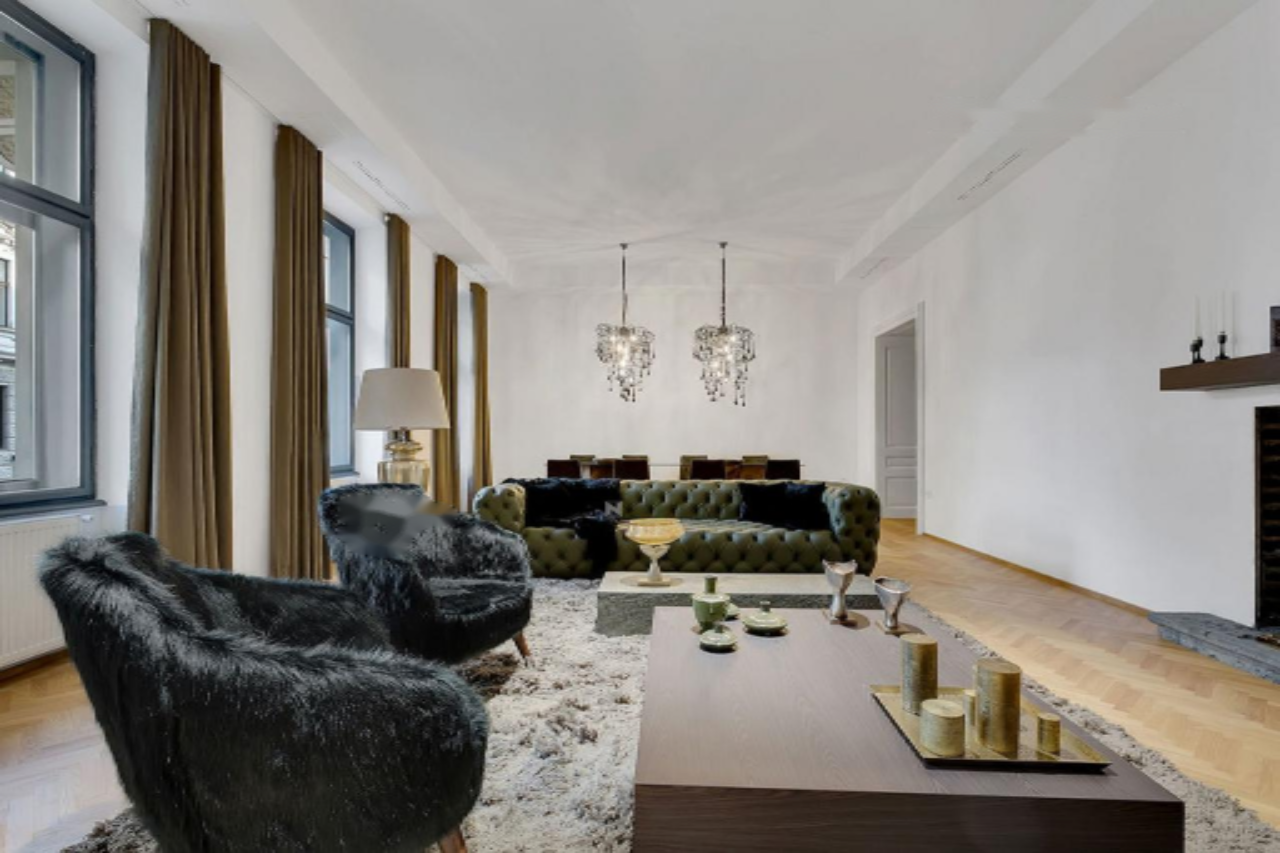 Общая площадь квартиры составляет 227 м², что создаёт просторное и функциональное жилое пространство высокого уровня. Просторная и стильная гостиная с камином и зоной столовой оборудована уникальной мебелью бренда Velana Living, выражающей вечную элегантность. Кухня сочетает утончённость с практичностью, создавая гармоничное пространство для приготовления пищи.