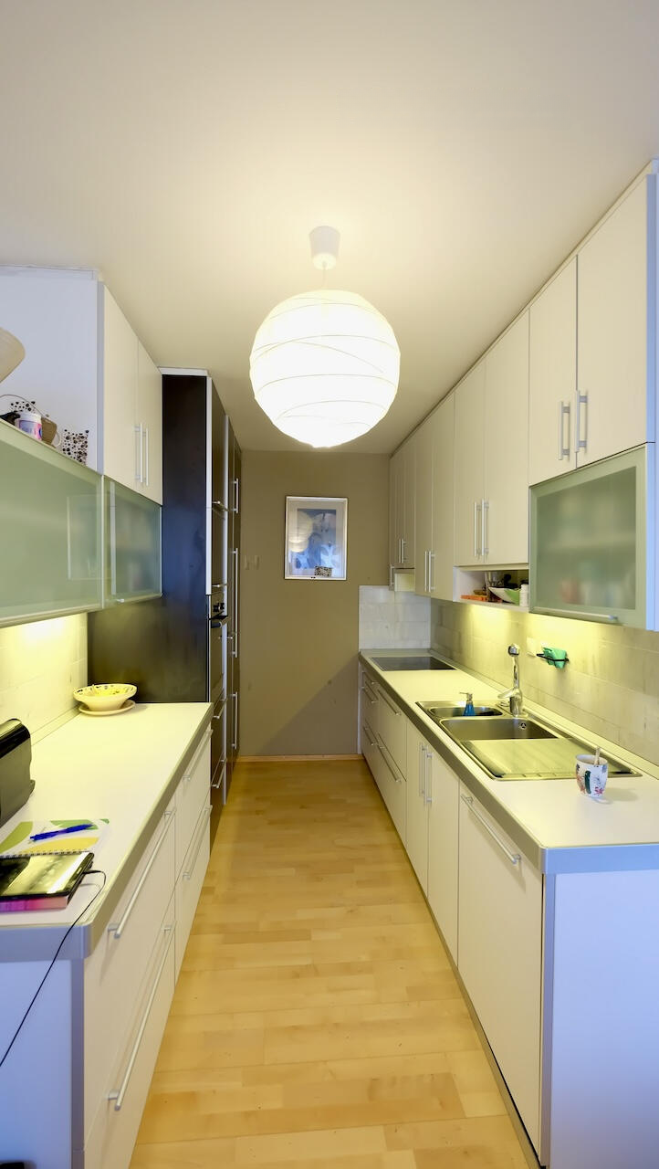 Квартира включает просторную кухню с обеденным уголком, гостиную с выходом на балкон, спальню и две детские комнаты с оконными проемами на север. Кроме того, имеется отдельный туалет и ванная, обновленная в 2000 году, а также просторный коридор. В квартиру входит кладовая площадью 3,6 м² и общая велопарковка в доме .