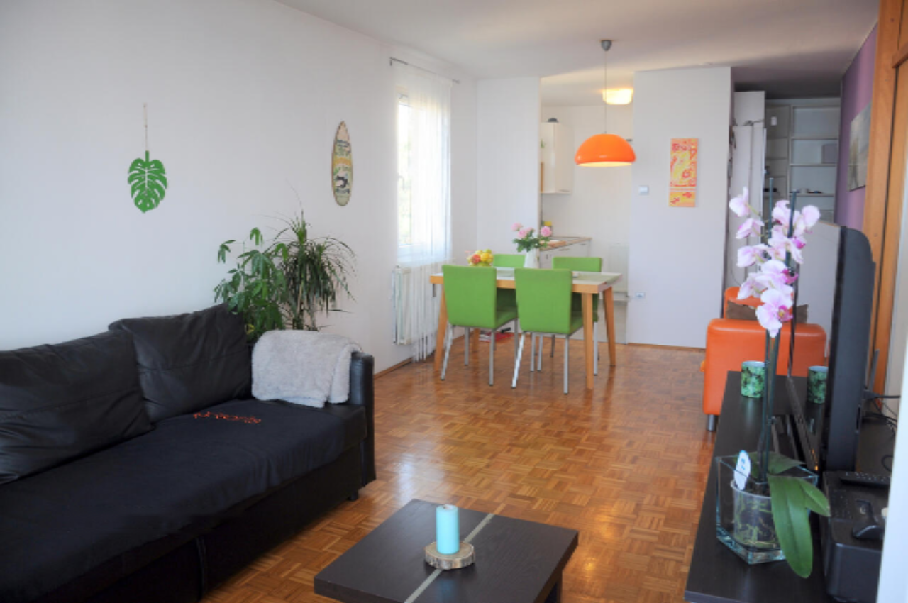 Квартира общей площадью 54 м², из которых 41 м² — жилая площадь, 9 м² — отличный балкон, и 4 м² — кладовая. Планировка включает кухню, светлую гостиную с обеденной зоной и выходом на балкон, одну спальню, ванную комнату и холл. Оснащена центральным отоплением из котельной Марковец, радиаторами и кондиционером для дополнительного обогрева и охлаждения. Северное расположение делает квартиру светлой и проветриваемой.
