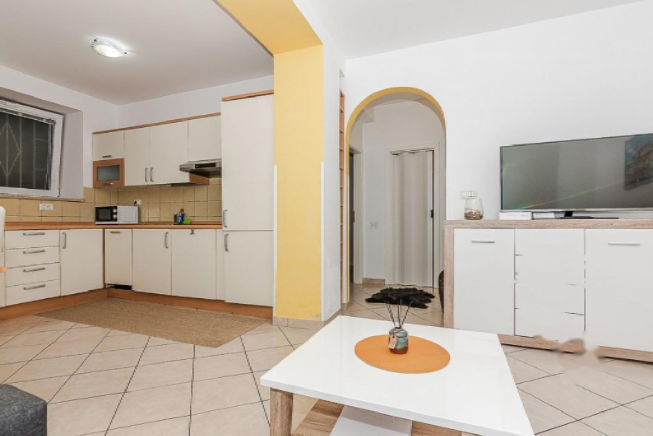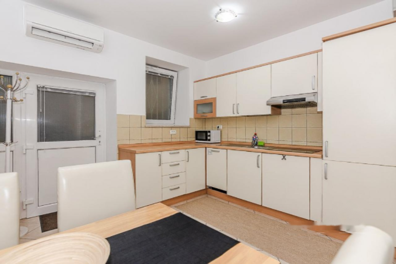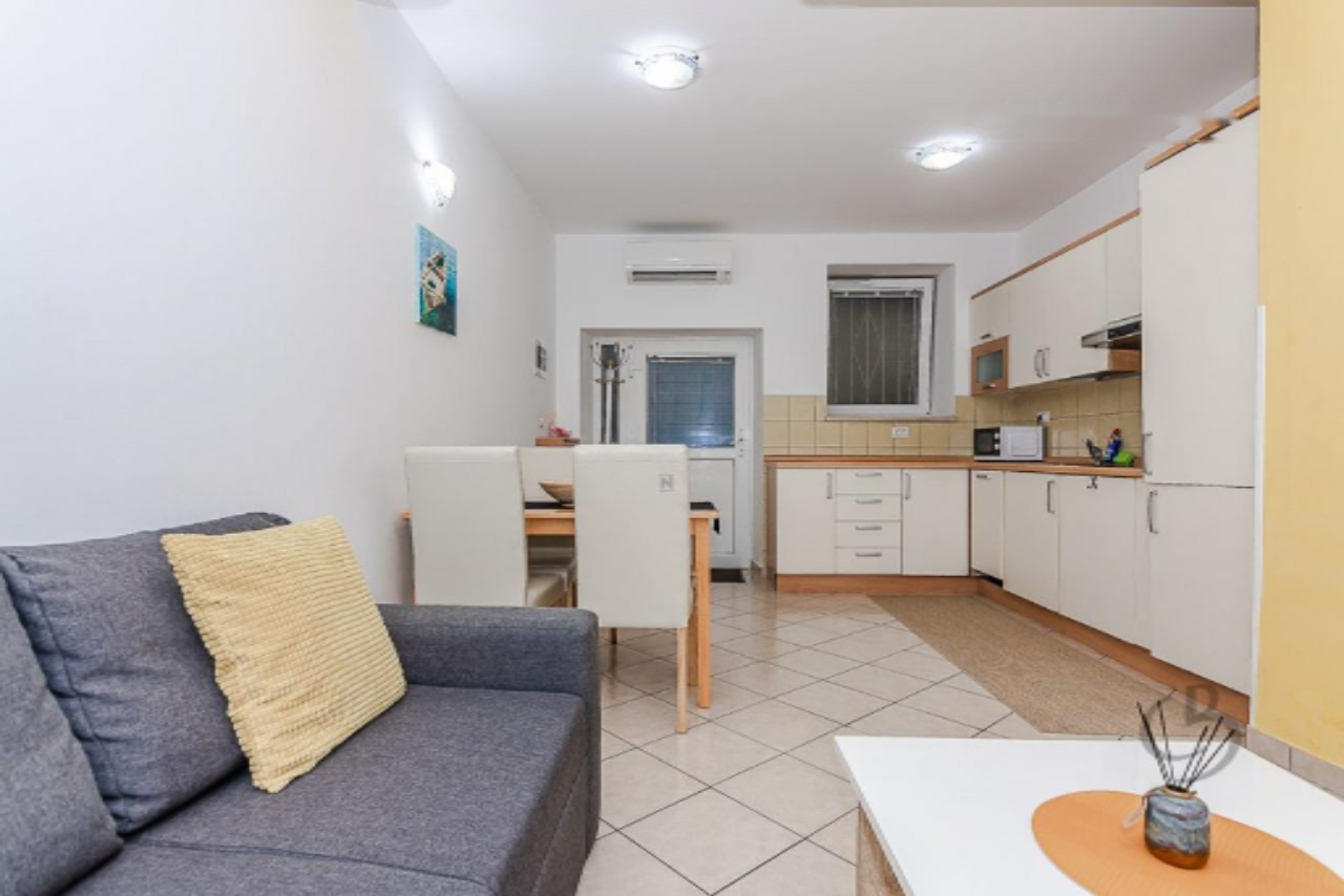 Квартира расположена в многоэтажном доме, но имеет отдельный вход, что обеспечивает дополнительное удобство и приватность. В интерьере представлен просторный дневной зал с оборудованной кухней и обеденной зоной. Спальня оснащена двуспальной кроватью, а ванная комната — душевой кабиной и необходимыми санитарными приборами.