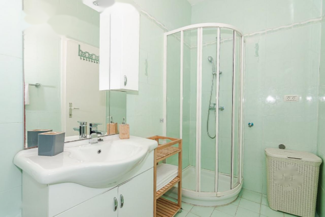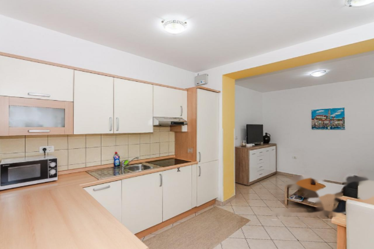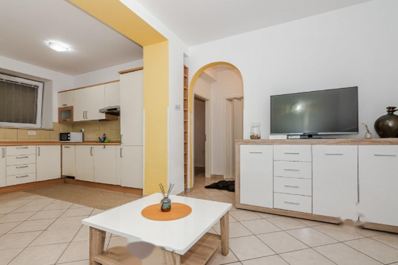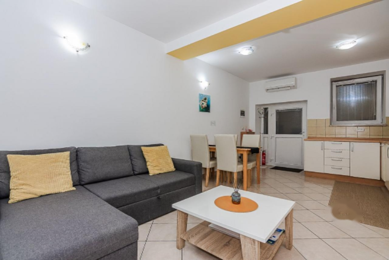 Квартира расположена в многоэтажном доме, но имеет отдельный вход, что обеспечивает дополнительное удобство и приватность. В интерьере представлен просторный дневной зал с оборудованной кухней и обеденной зоной. Спальня оснащена двуспальной кроватью, а ванная комната — душевой кабиной и необходимыми санитарными приборами.