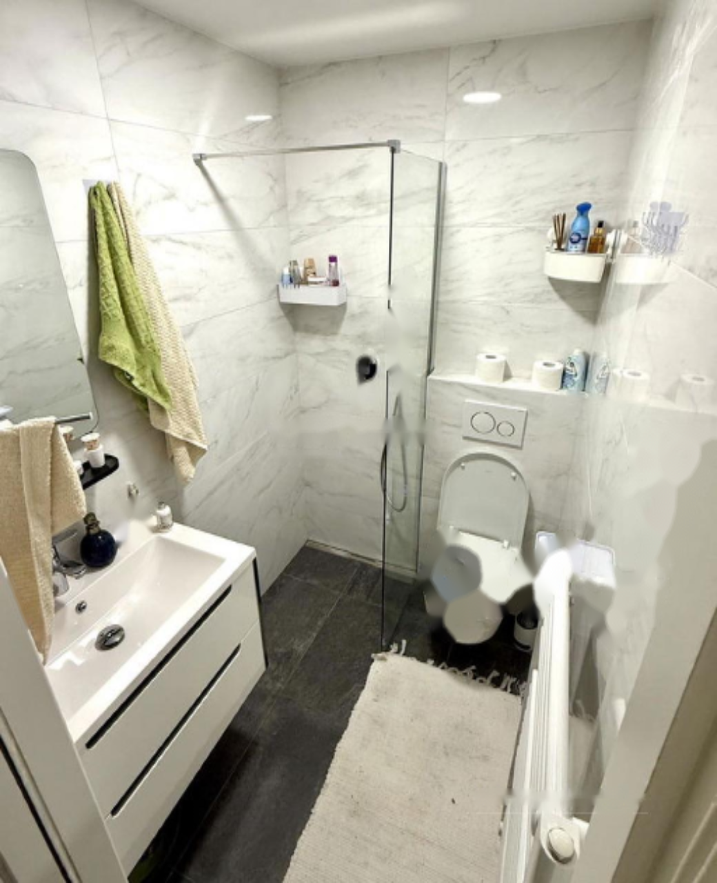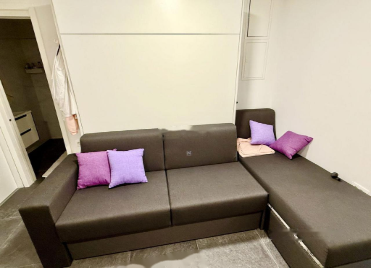 Кухня оснащена всей необходимой бытовой техникой, включая варочную панель с духовкой, вытяжкой, холодильником и посудомоечной машиной. В жилой зоне встроенный гардеробный шкаф, телевизионная тумба, стиральная машина и диван-кровать, который складывается в шкаф, что позволяет значительно увеличить пространство.