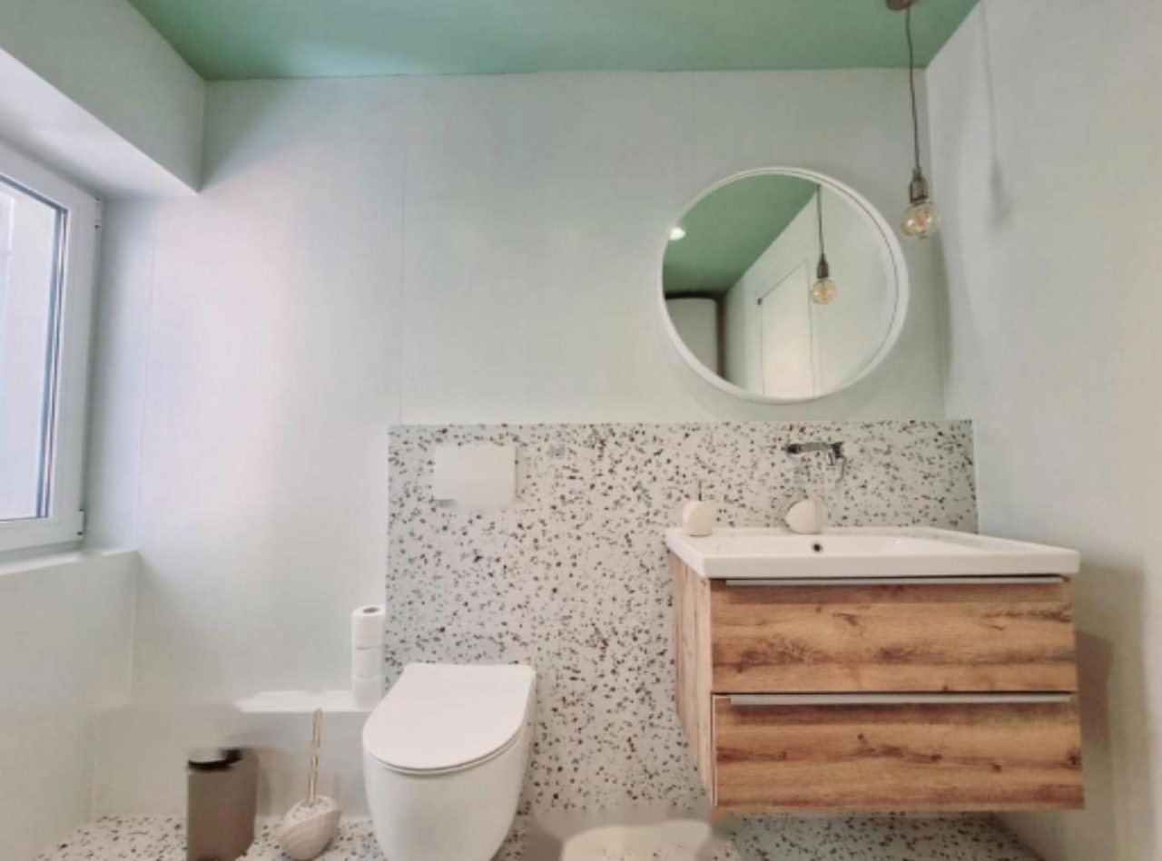 Первая жилая единица представляет собой квартиру на третьем этаже площадью 45 м². Она включает в себя просторную гостиную с кухней и великолепным видом на Пиранский мост, большую ванную комнату и спальню с выходом на частную террасу.
