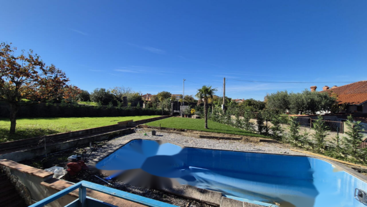 На придомовой территории площадью 568 м² имеется открытый гараж на несколько автомобилей и огороженный сад с автоматическим поливом и большим бассейном. Это жильё также вмещает балконы и террасы, просторный двор и насаждения. Система отопления представлена тепловым насосом и напольным отоплением, а также двумя кондиционерами. Подключение к оптическому интернету обеспечено.