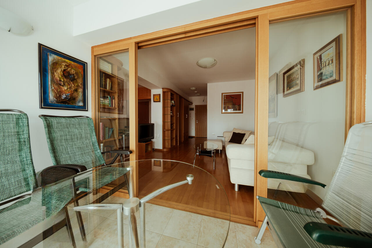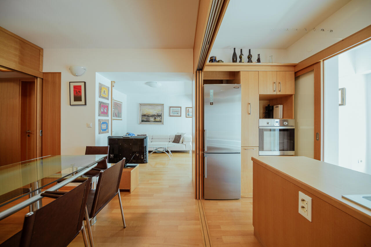Квартира светлая, обращена на южную сторону, предлагая боковой вид на Пиранскую церковь и сам город. Окружение приятно дополняют широкие лестницы и наличие лифта в здании. Планировка включает: прихожую, ванную комнату, гостиную, столовую, кухню с островом, спальню, лоджию с дополнительной столовой зоной и пространством. В доме предусмотрено общее помещение для хранения и велосипедная комната. Объект первой линии у моря.