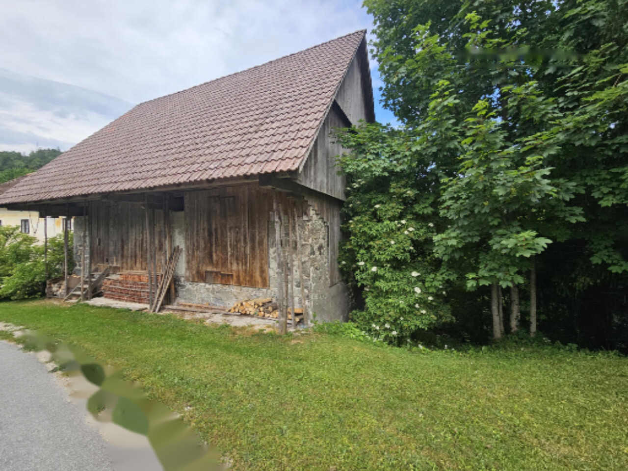 Хлев, частично каменный, частично деревянный, характеризуется площадью 147 м² и находится в хорошем состоянии, включая различные старинные рабочие инструменты. Общий земельный участок (427 м²) является застроенным, остальная часть — это сельскохозяйственные земли и леса.