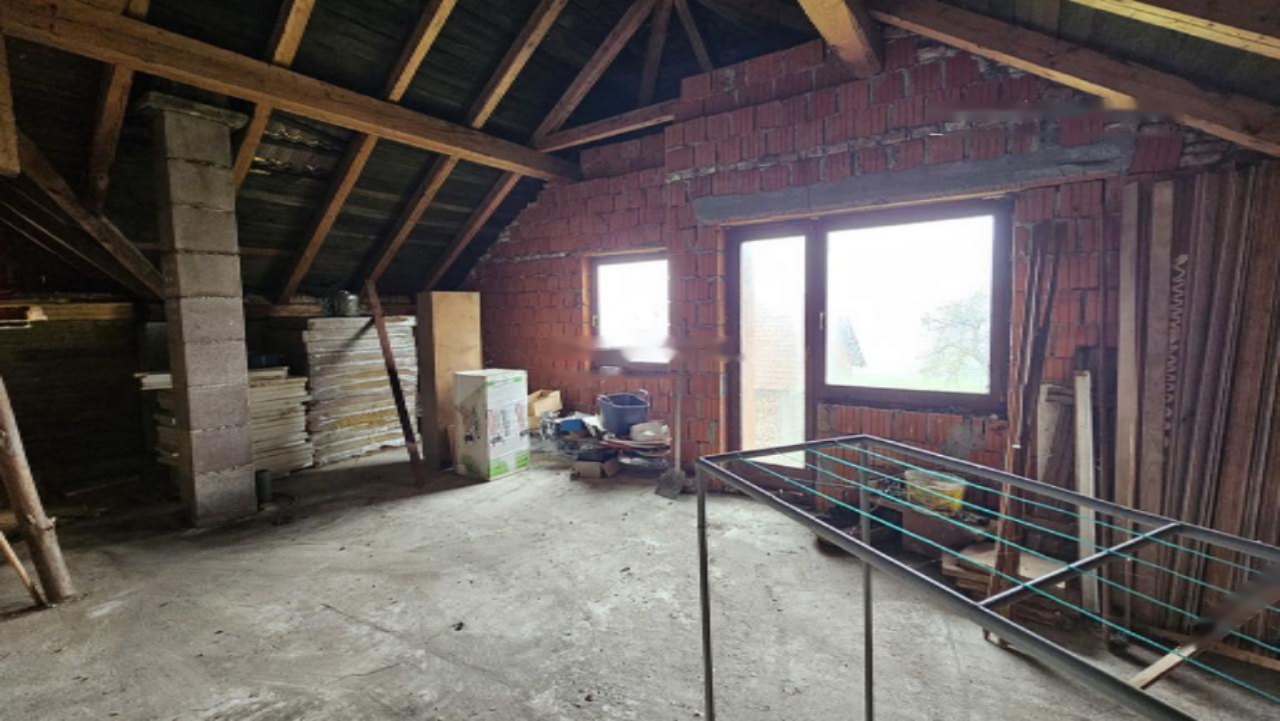 Предлагается хозяйство с жилым домом общей площадью 158,4 м² и земельным участком 25.862 м², предназначенное для проживания и сельскохозяйственной деятельности. Объект находится в стадии недостроенности, отсутствует фасадная отделка. Дом возведён в 1992 году и имеет 70 м² жилой площади, предусмотрена возможность обустройства мансарды согласно проектной документации.