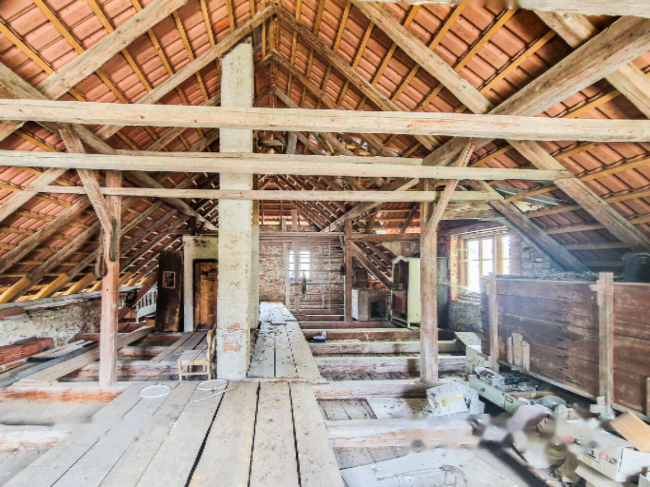 Жилая каменная усадьба была изначально построена в 1887 году и капитально восстановлена после пожара в 1945 году. Общая площадь дома составляет 180 м². Объект обслуживается и был заселён до 2009 года, с регулярными обновлениями, такими как замена крыши в 2012 году и полный дренаж вокруг всей конструкции. Хлев площадью 70 м² подходит для использования в качестве мастерской, склада или для иных сельскохозяйственных нужд. Козловый сарай с полезной площадью 75 м² выполнен из дерева и имеет высокую практическую ценность. Предусмотрен также свиняк площадью 15 м². Все постройки ухожены, но требуют косметического обновления.