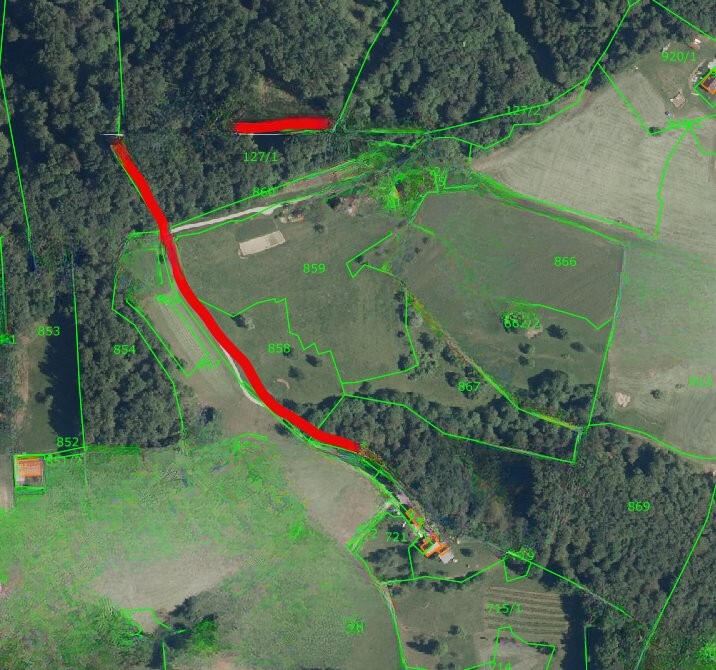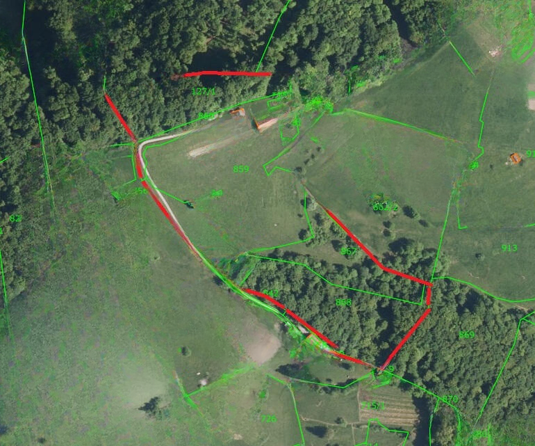 Инженерные коммуникации не упомянуты. Юридический статус участка позволяет его использование как для сельского хозяйства, так и для строительства, с 2.800 м² выделенных под строительство и 1,5 га леса. Остальная часть участка предназначена для пастбищ и пашен.