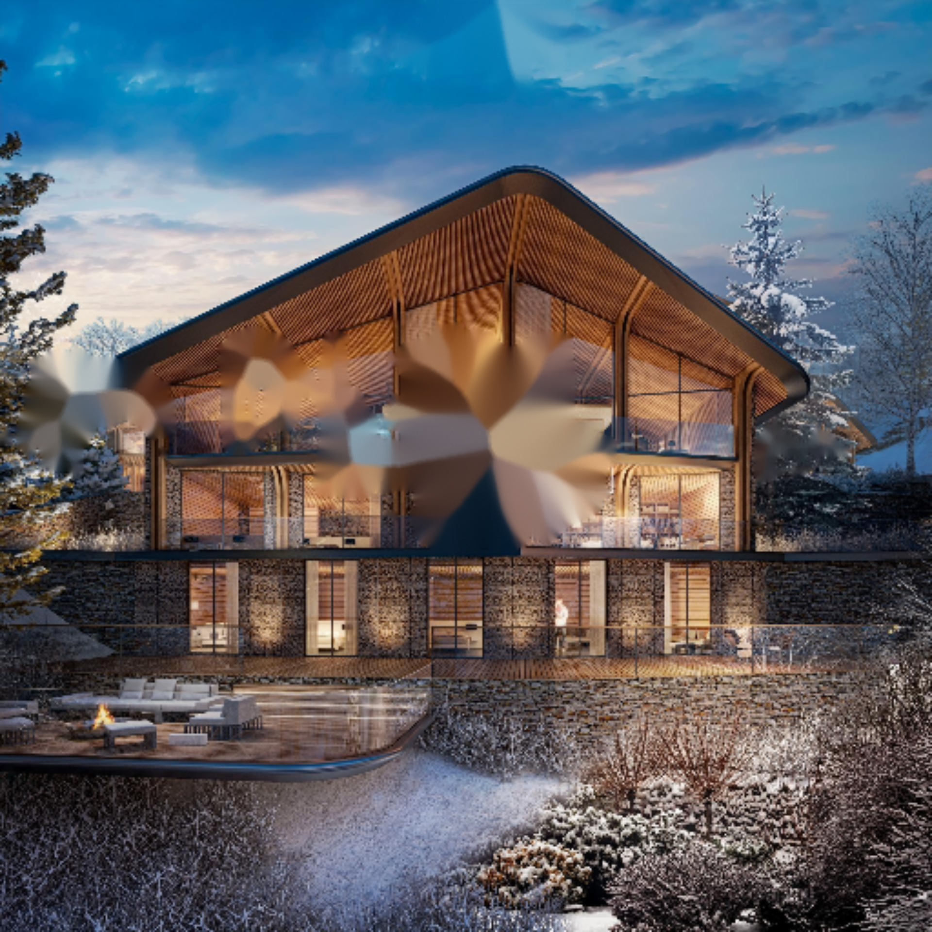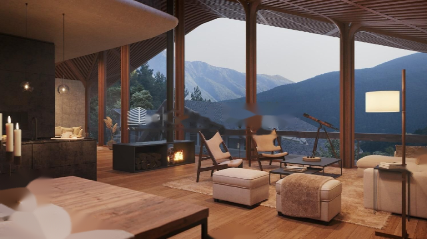 Хотя дерево и камень - традиционные материалы, здесь они используются как современные, что придает проекту инновационный облик и связь с окружающей средой. Панорамные окна, ориентированные на великолепные пейзажи и общие зоны, объединяют природу и архитектуру.