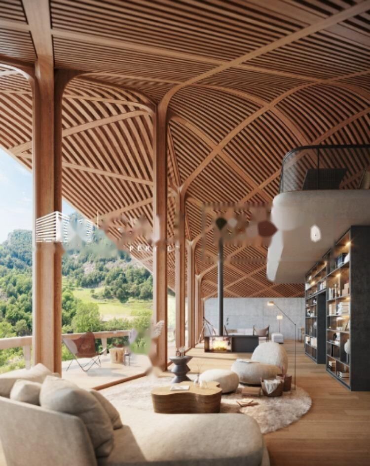 Хотя дерево и камень являются традиционными материалами, в проекте они используются как современные материалы, создавая инновационный облик, но при этом оставаясь привязанными к месту. Большие стеклянные панели, ориентированные на невероятный ландшафт и общие пространства проекта, придают комплексу новаторский вид и соединяют природу с архитектурой.