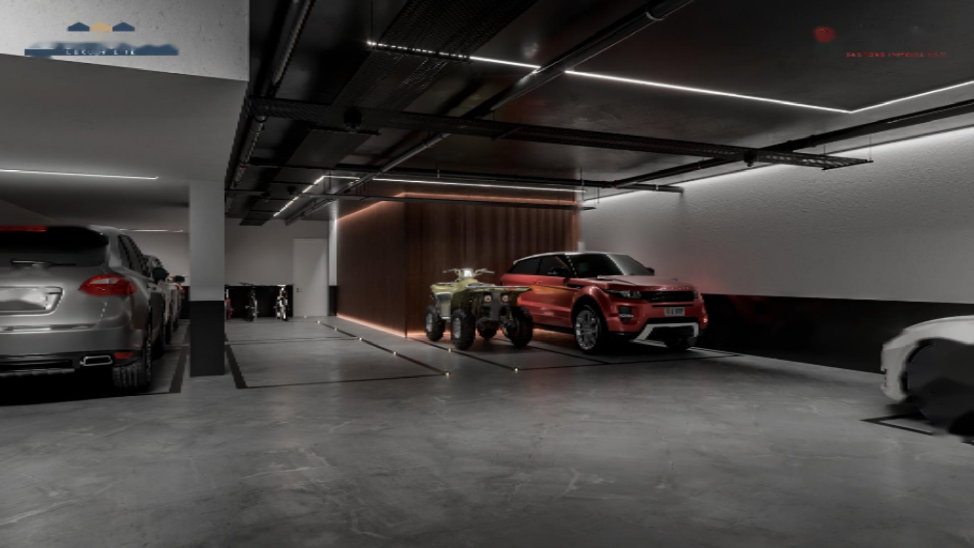 Особое внимание привлекает частный лифт, обеспечивающий удобный доступ на все этажи дома. В подвале шесть парковочных мест, что гарантирует достаточно пространства для всех автомобилей, а также есть большое хранилище для любых дополнительных нужд.