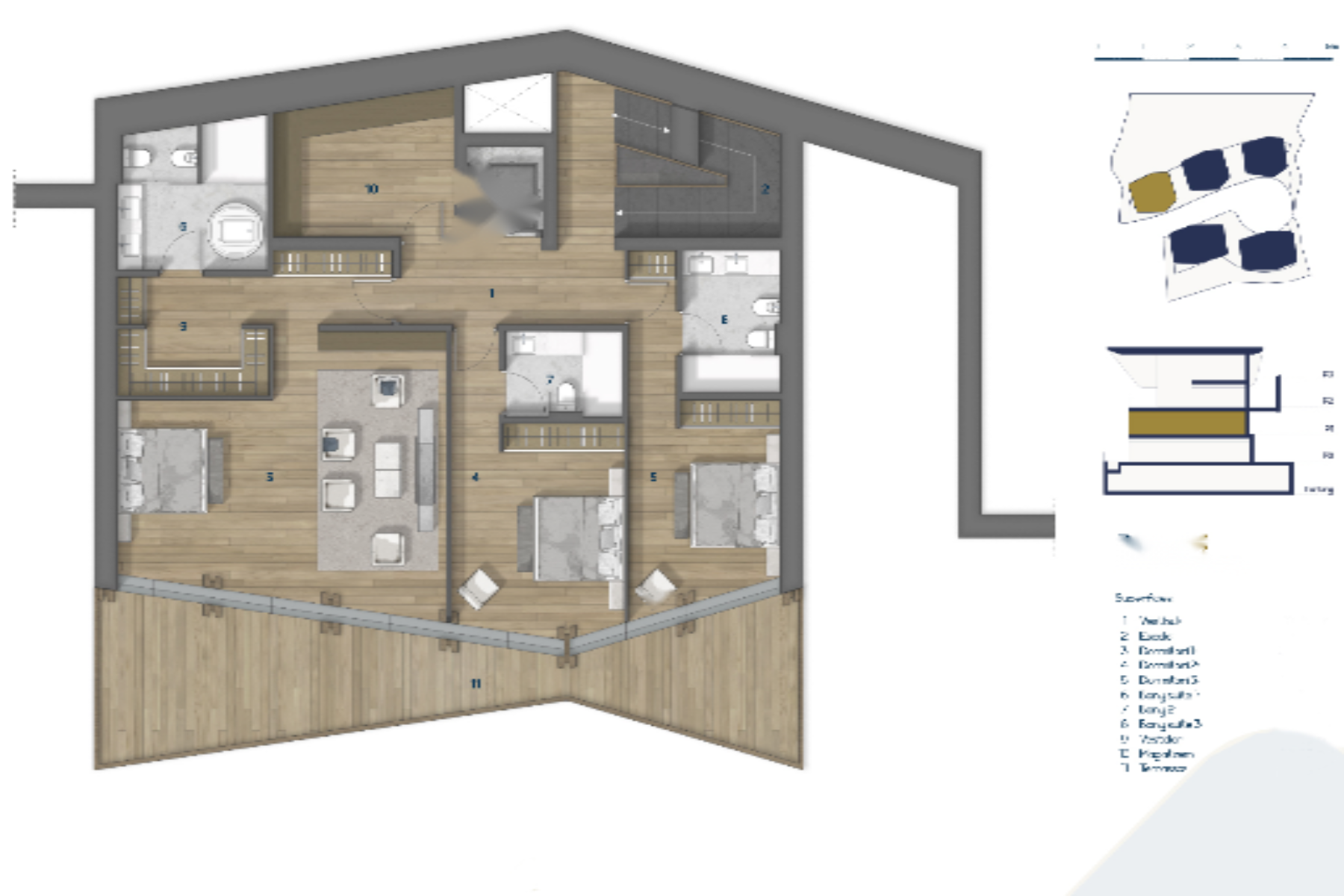 Третий этаж представляет просторную кухню с центральным островом, оснащённую новейшими технологиями и смежную с уютной столовой, с выходом на террасу. Здесь также расположены гостиная и библиотека, обе со свободным доступом на террасу, а также туалет и прачечная. На последнем этаже, под крышей, находится функциональный кабинет.