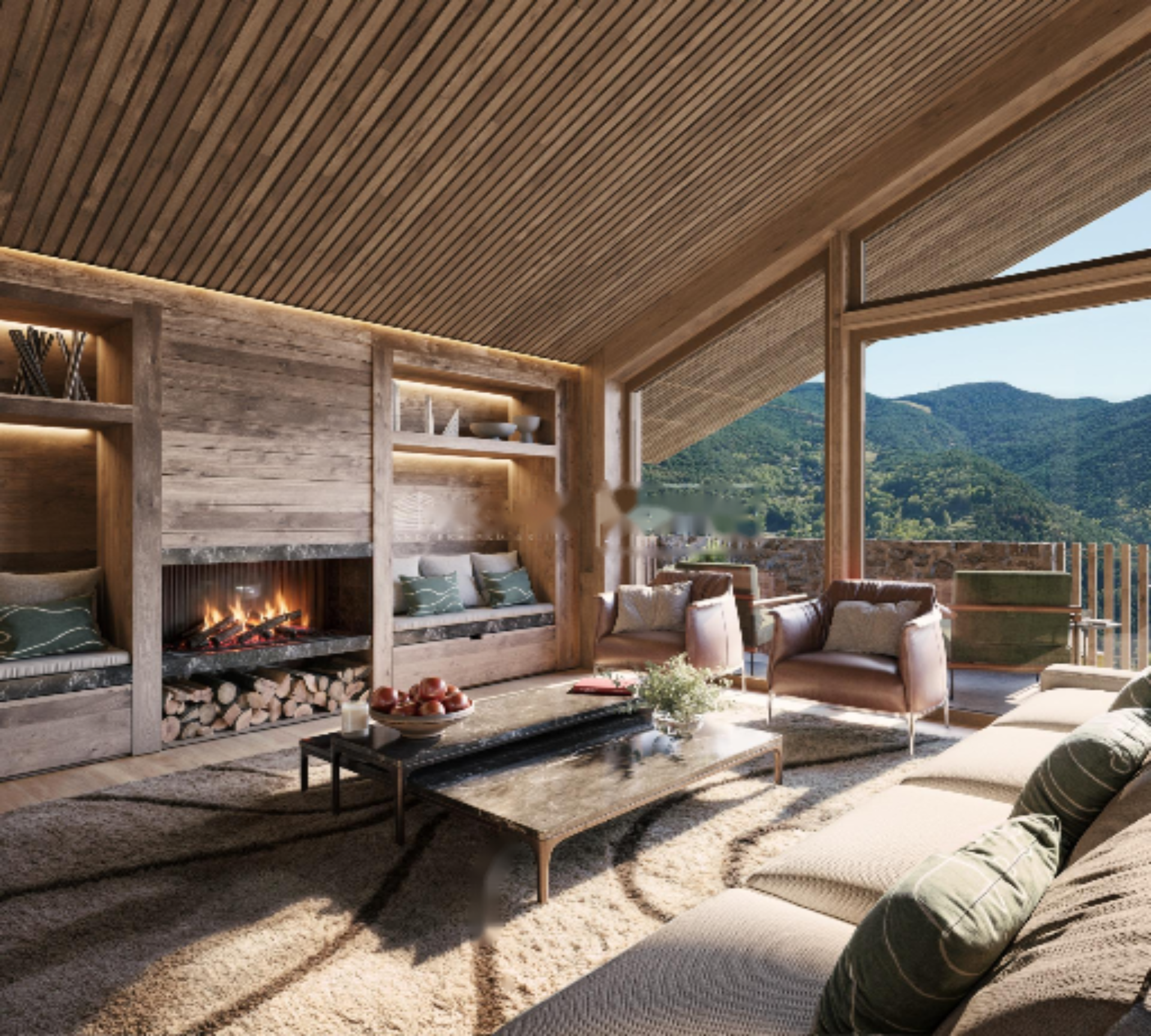 Интегрируемый камин Stuv, гардероб для лыж с шкафчиками и сушилкой для обуви, низкоэксплуатационный сад и гидросеяние, бесшумный лифт и лифт для подъема автомобилей в гараж, предварительная установка для зарядки электромобиля, фотопанели.