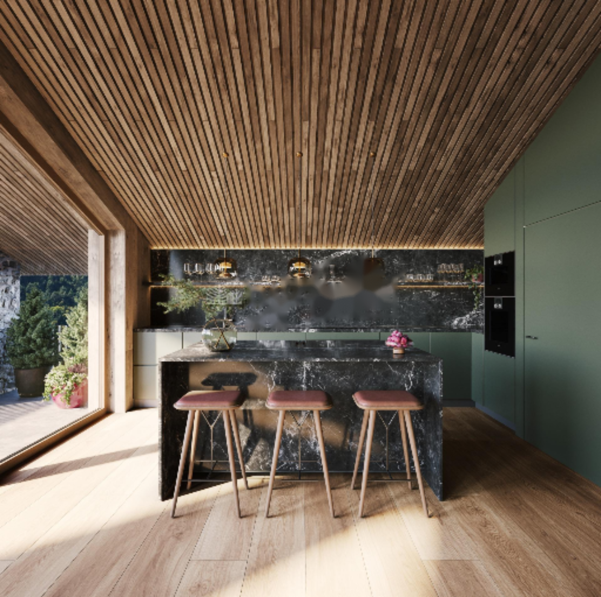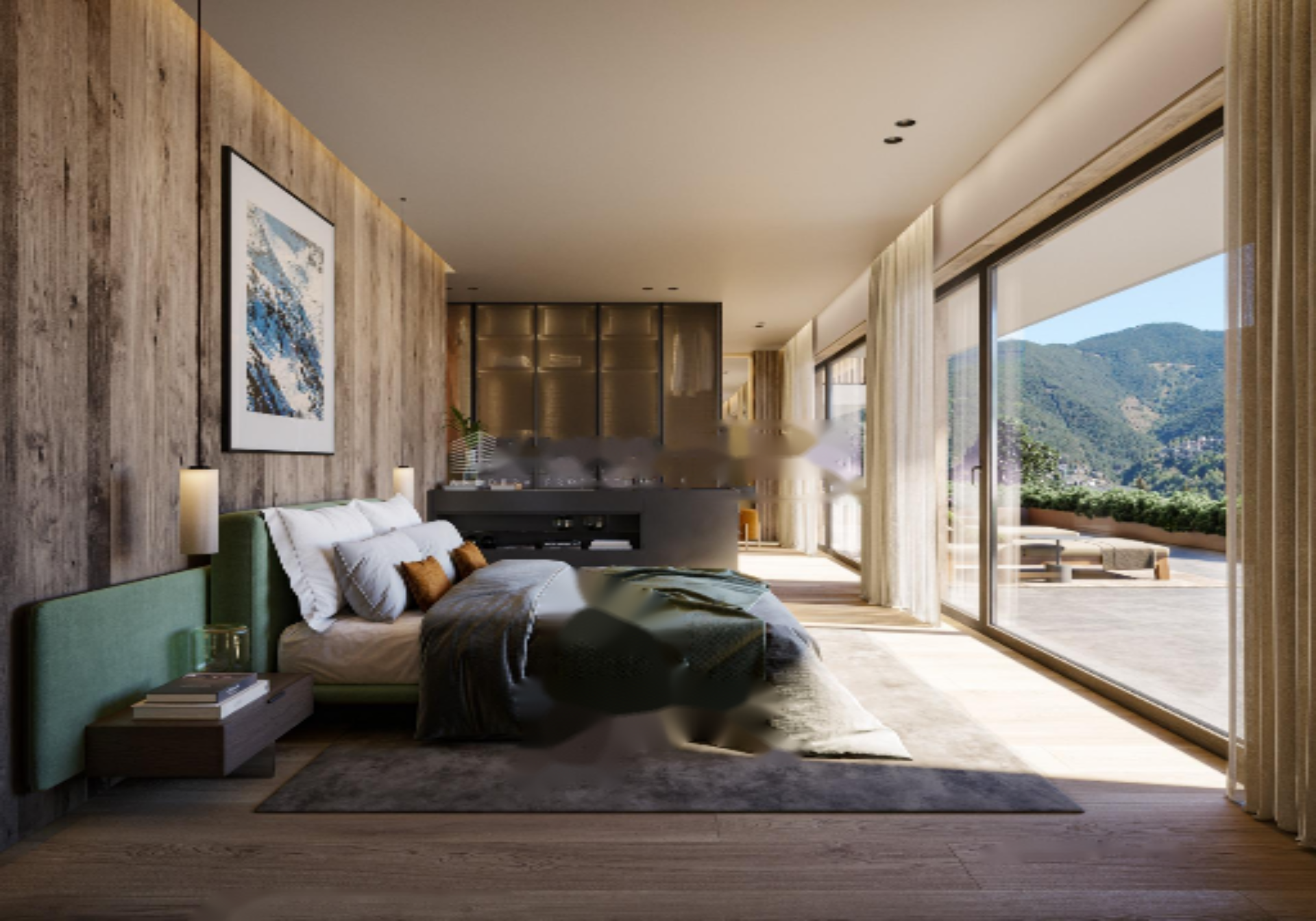- Этаж -1: ночная зона с тремя большими спальнями, каждая с собственной ванной комнатой и встроенными шкафами, выходящими на вторую террасу.