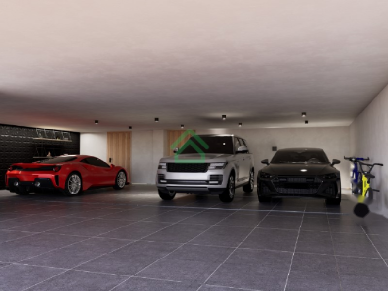 На уровне гаража площадью 165 м² вы найдете просторный холл с встроенными шкафами и техническим помещением. Легко разместятся 4 или 5 автомобилей, и есть две автоматические двери, а лифт поднимает вас прямо с гаража, чтобы избежать лестниц.