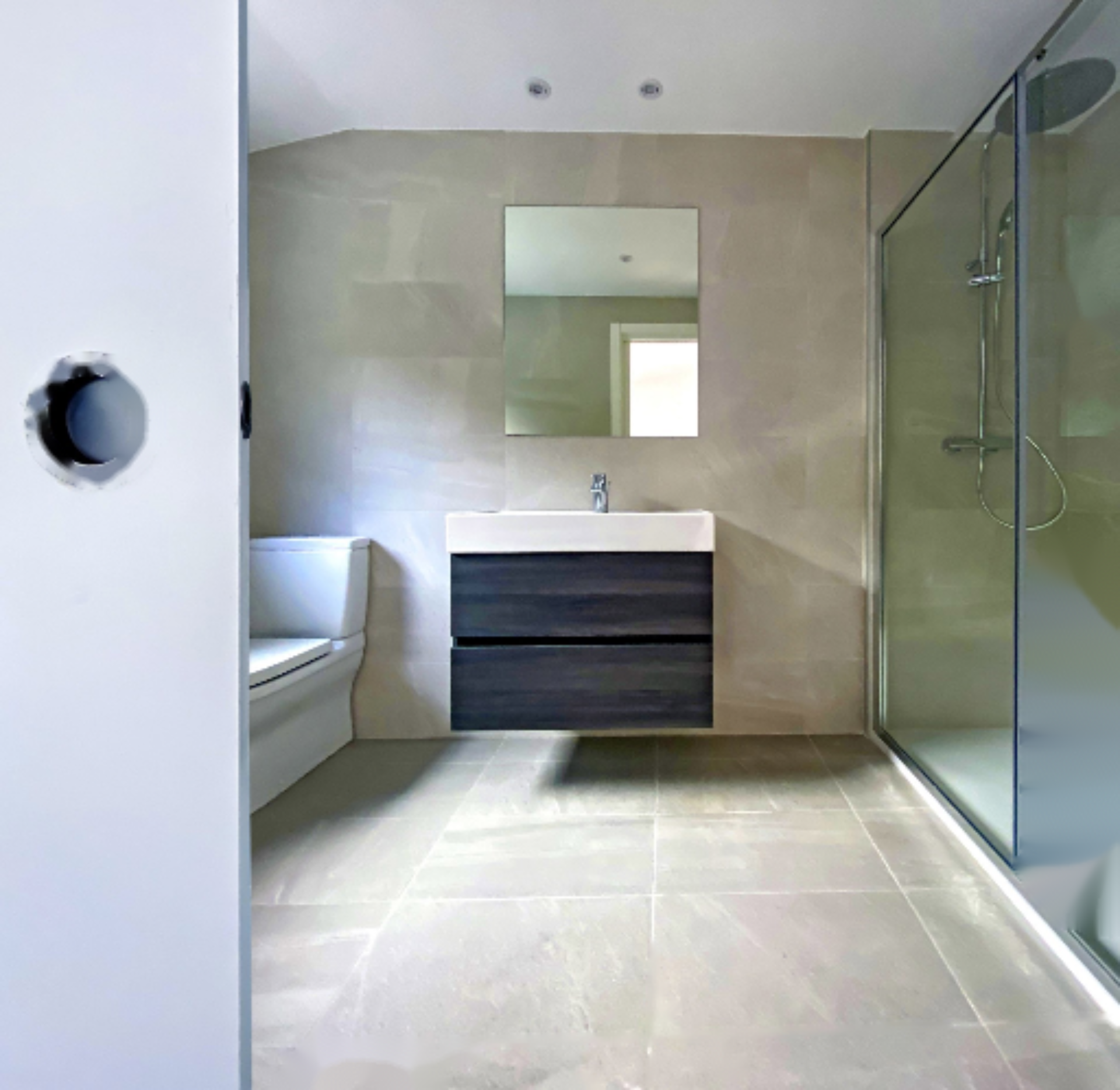 Внутренние полы обшиты ламинатом во всей квартире, за исключением ванных комнат, выполненных из керамогранита. Ванные комнаты впечатляют дизайном и функциональностью, с белоснежной сантехникой марки Roca (или аналогичной), однорычажными смесителями и вместительными подвесными шкафами. Встроенные раковины придают элегантный и современный вид.