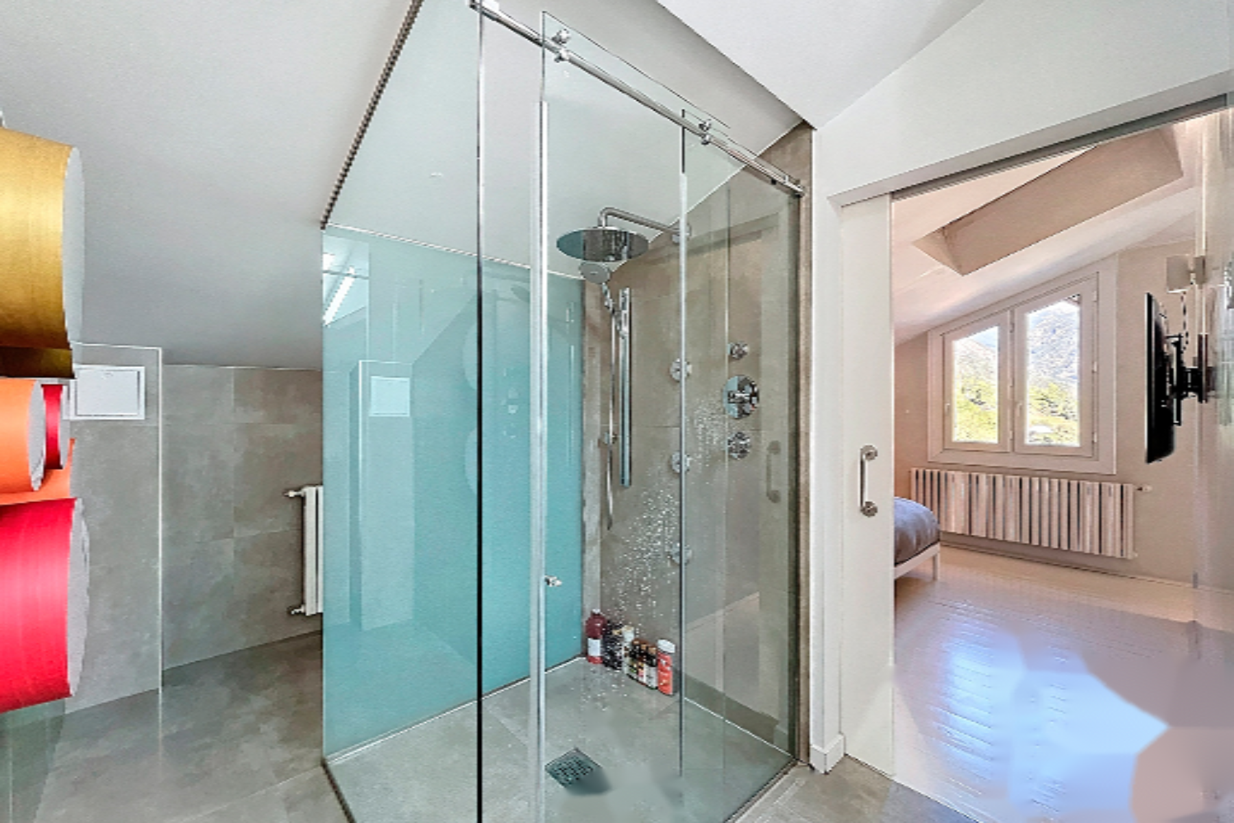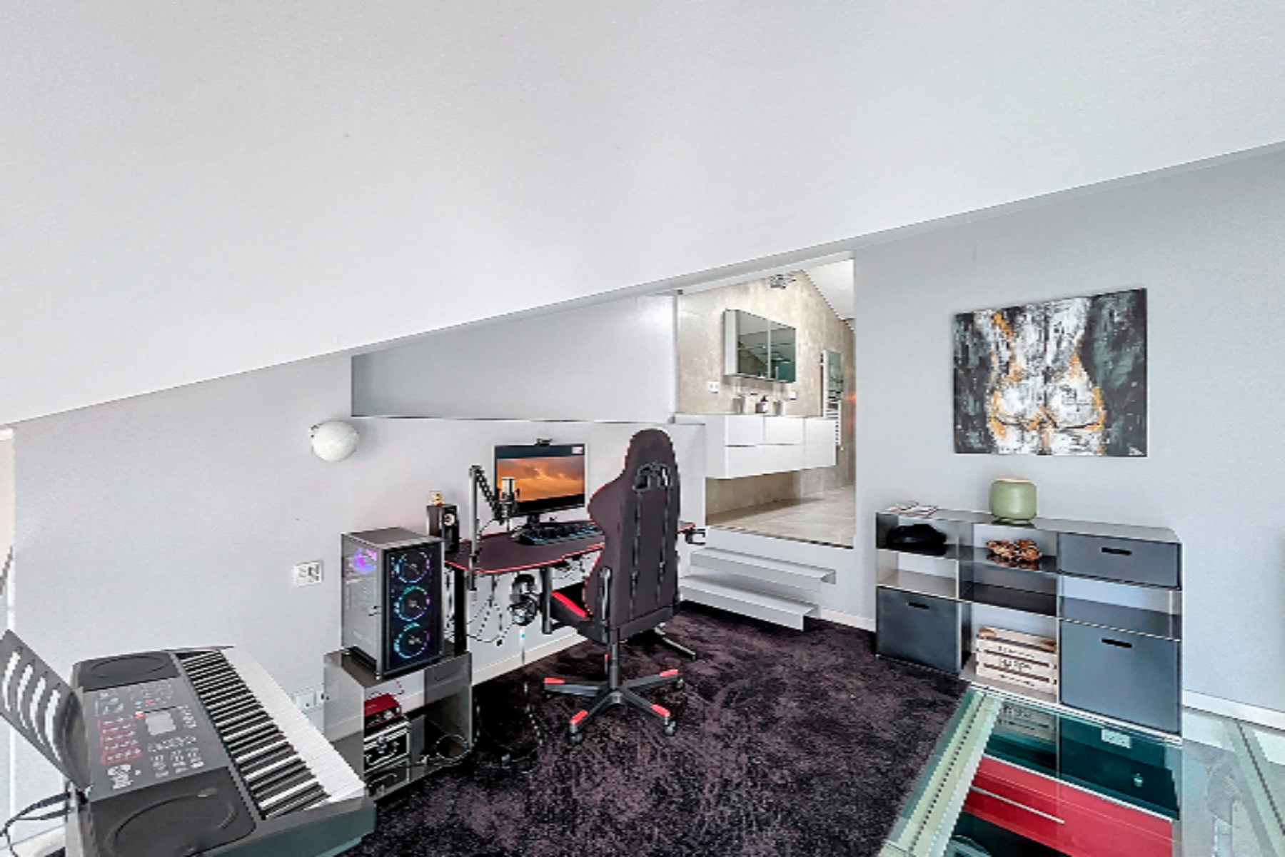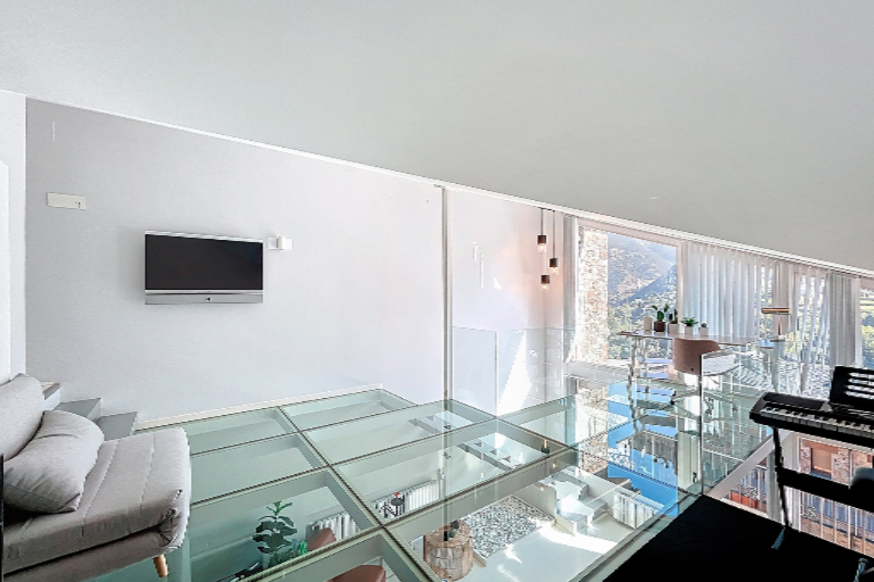Мы поднимаемся на верхний этаж по лестнице, где нас ожидает помещение, обустроенное под офис или зону для музыки и отдыха, с окнами с видом на горы и прозрачным стеклянным полом, создающим эффект простора. Также здесь находится ночная зона, с мастер-сьют с гардеробом и полноценной ванной комнатой с панорамными окнами в потолке.