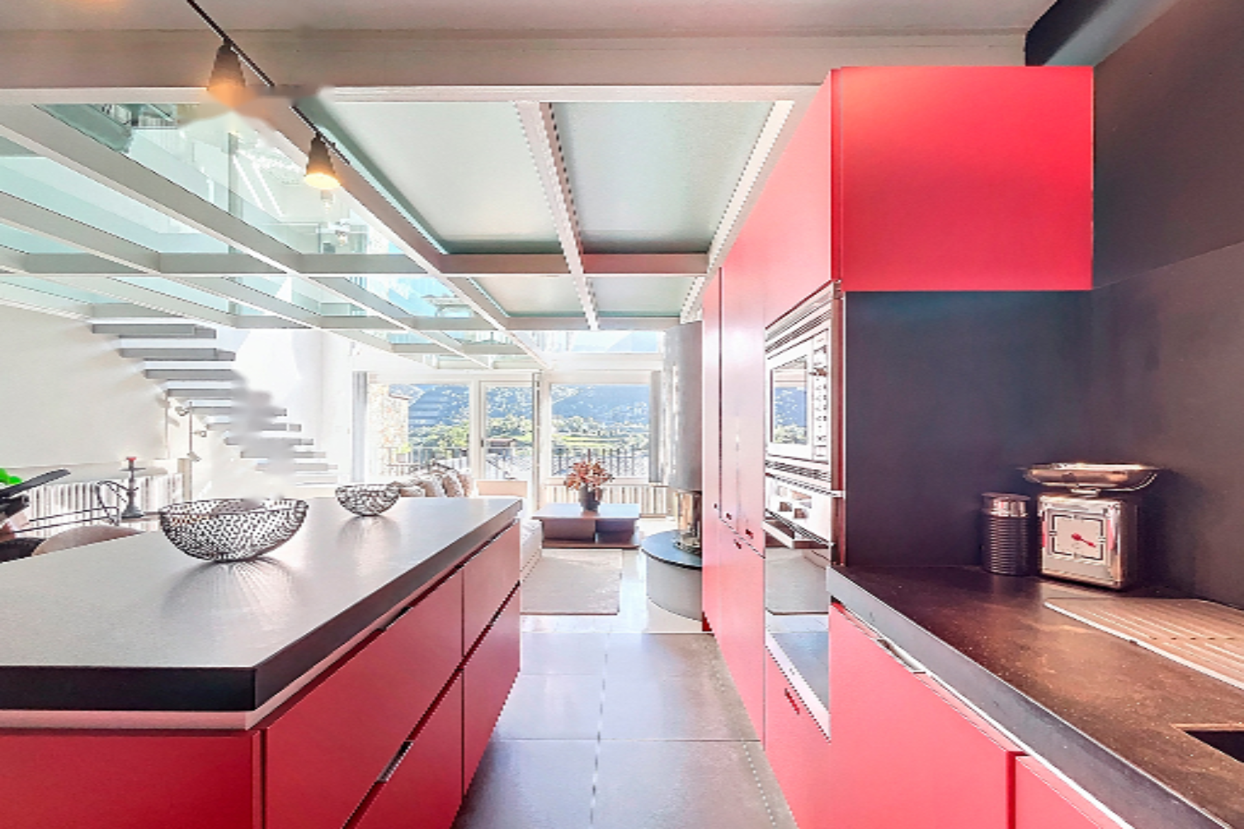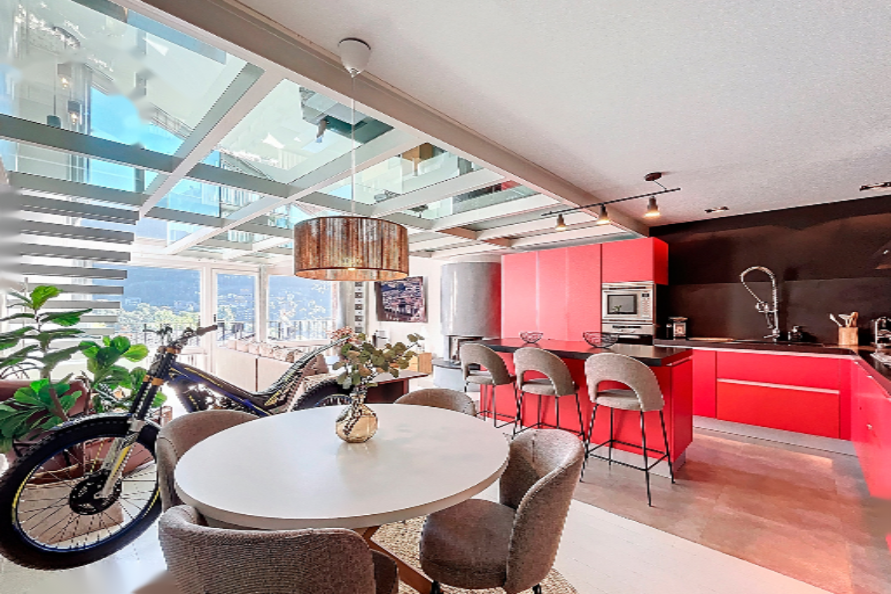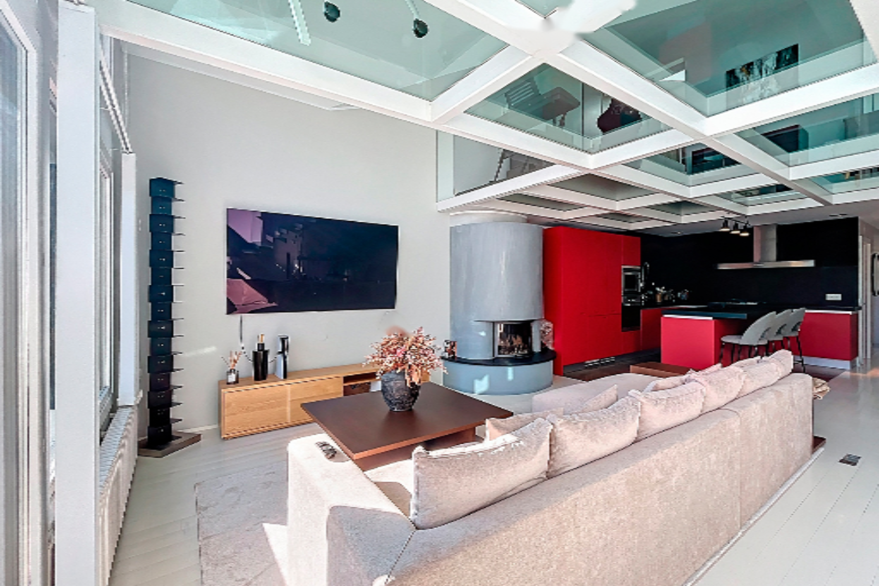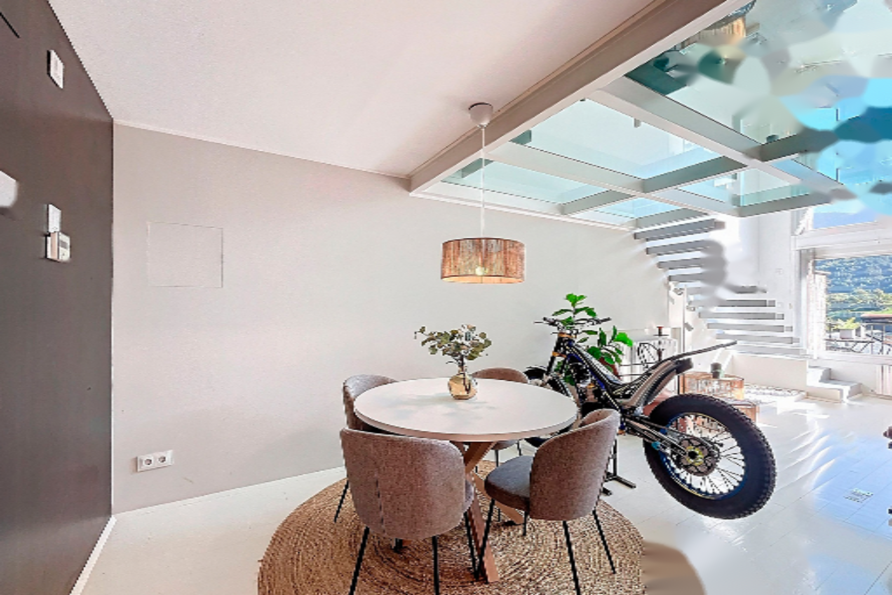 Мы поднимаемся на верхний этаж по лестнице, где нас ожидает помещение, обустроенное под офис или зону для музыки и отдыха, с окнами с видом на горы и прозрачным стеклянным полом, создающим эффект простора. Также здесь находится ночная зона, с мастер-сьют с гардеробом и полноценной ванной комнатой с панорамными окнами в потолке.