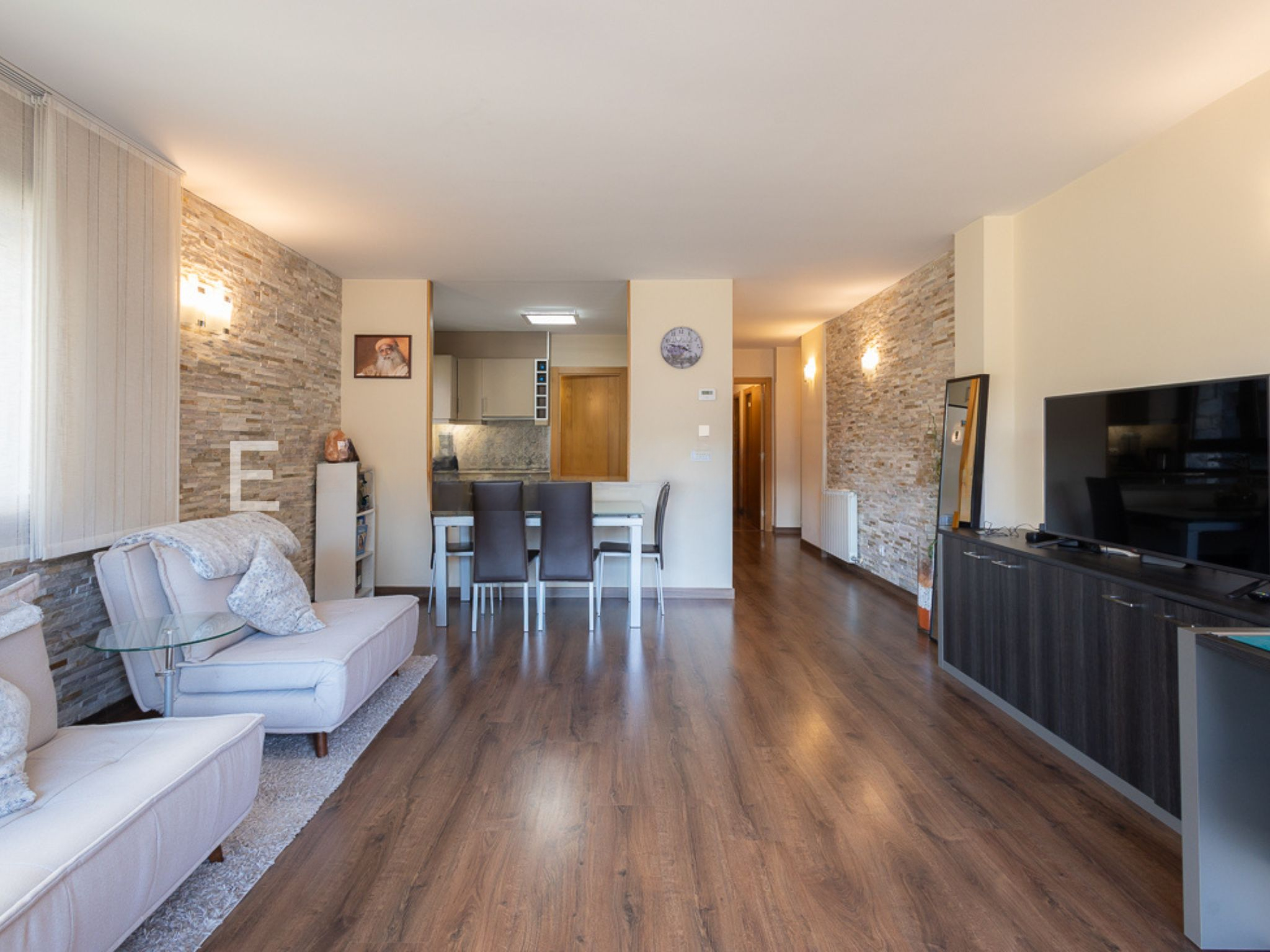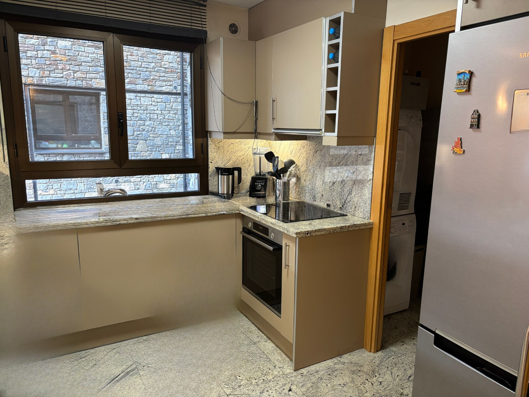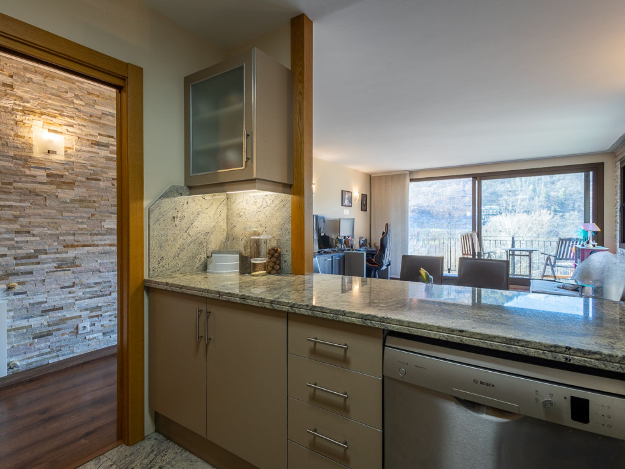 Дневная зона открывается в просторный и светлый зал-столовую с интегрированной кухней, создавая теплую и уютную атмосферу, приглашающую проводить особенные моменты. Кухня включает удобную зону для стиральной машины и хранения, обеспечивая порядок и комфорт в повседневной жизни. Из этой комнаты есть выход на очаровательную террасу площадью 4,21 м², идеальное уединенное место для отключения от суеты, отдыха или просто любования красивыми видами на долину.