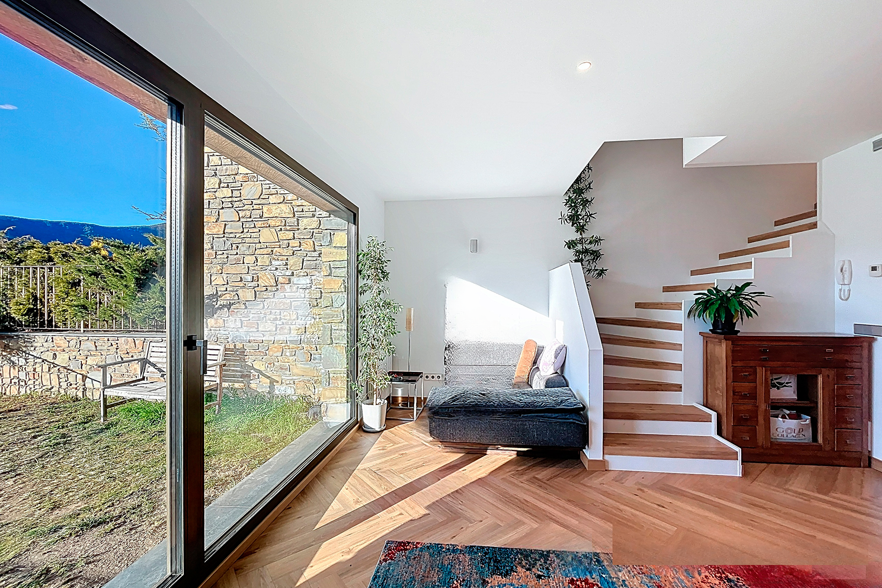 На первом этаже находится уютная гостиная и столовая с выходом в сад, откуда открываются впечатляющие виды на Escaldes и Андорру. Этот уголок, освещаемый полуденным солнцем, идеально подходит для приятного отдыха на свежем воздухе. Здесь же расположены оборудованная кухня и гостевой туалет.