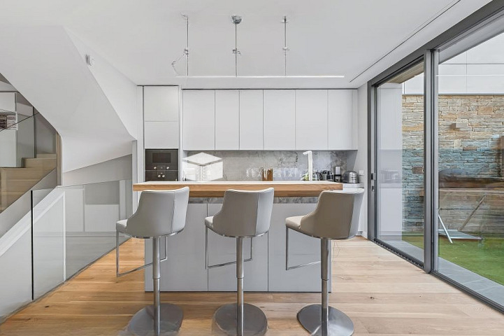 По части удобств, дом построен из качественных материалов и оборудован паркетом из натурального дуба, керамическими покрытиями и фасадом, который сочетает местный камень с современными линиями. Кухня оснащена высококлассной мебелью и первоклассной техникой, рассчитанной на интенсивное использование.
