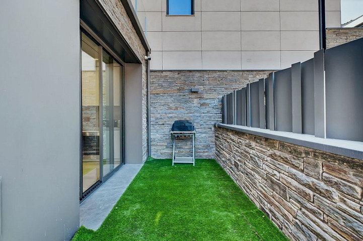 На первом этаже дом полностью открыт наружу. На передней части дома располагается уютный сад площадью около 50 м², который сочетается с террасой около 13 м², создавая идеальное место для наслаждения окружающей природой. На заднем дворе, соединенном с кухней, расположена вторая терраса около 10 м², оборудованная зоной для барбекю.