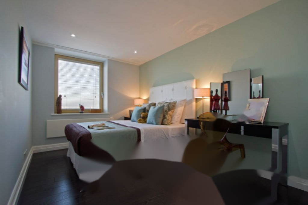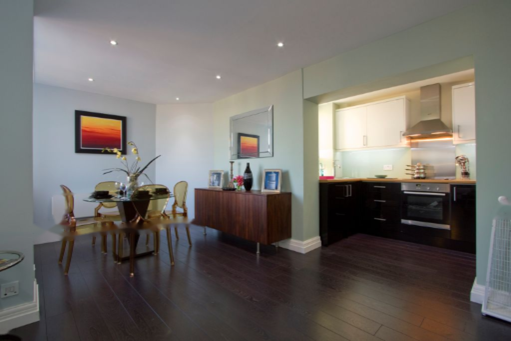 Жилое пространство состоит из двух спален, семейной ванной комнаты, гостиной и полуоткрытой кухни. Квартира находится на 12 этаже и предлагает виды на Город на востоке и реку Темзу на юге.