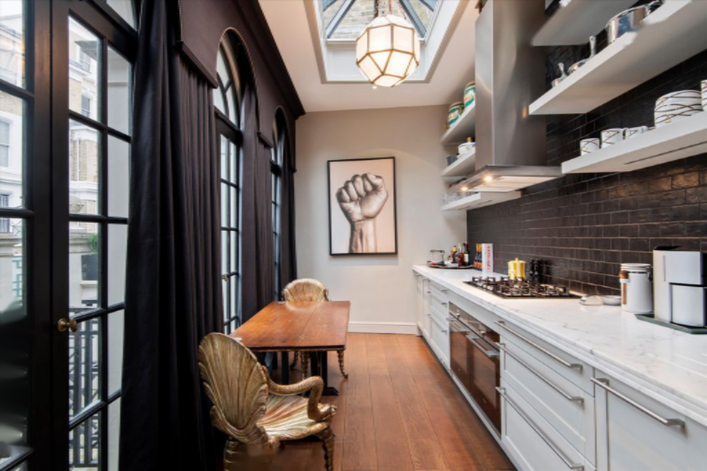 Скрытый за воротами на Redcliffe Square, дом организован вокруг уединенного патио в итальянском стиле. Жилая площадь включает великолепную гостиную с высокими потолками и камином в стиле французского Луи XV 19-го века с огненной корзиной в стиле Регенси. Просторная кухня Bulthaup оснащена мраморными столешницами Statuario и обеденной зоной, залитой естественным светом через большие палладиевые окна и сводчатый фонарь на крыше. Все комнаты выходят в восхитительное патио.