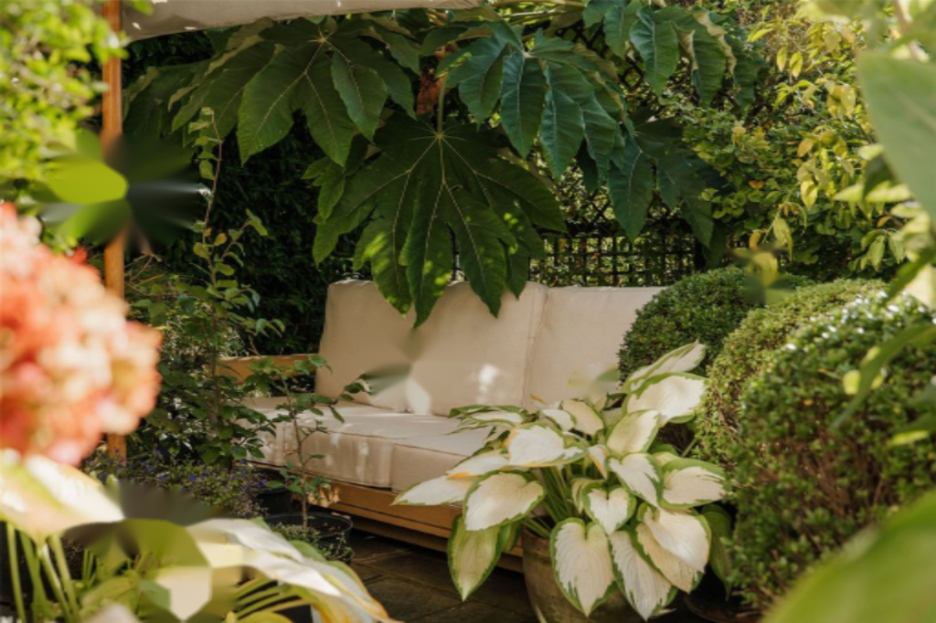 Южный сад открывается прямо на парковые пространства общего садового квадрата. Также есть балкон на первом этаже с видом на сад и терраса на крыше на третьем этаже. Наконец, в отдельном служебном доме есть парковка вне улицы для нескольких автомобилей, доступная через частный заезд.