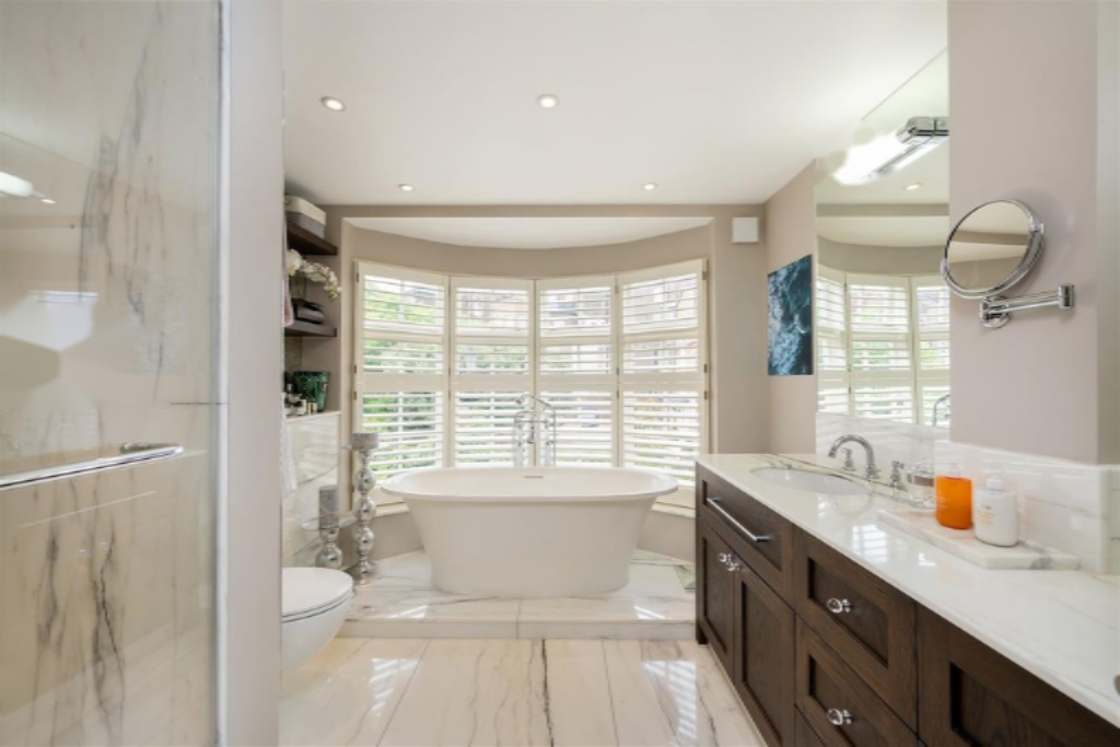 Особое удовольствие доставляет уникальное и необычно большое эркерное окно в основной ванной комнате.