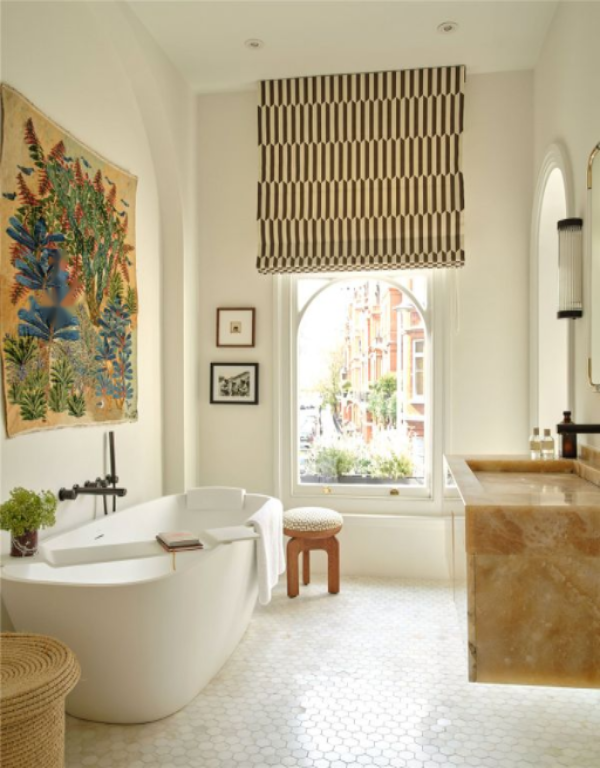 Квартира с двумя спальнями, высокими потолками и впечатляющими приемными, идеально подходящая для развлечений. Вход на первом этаже через эффектный передний холл, оформленный обоями с плетением и блестящей черной плиткой, отражающей свет из комнат по обе стороны. Справа находится просторная двойная гостиная; в одной ее части расположена официальная обеденная зона, в другой — уютная зона отдыха. Пара широких эркерных окон с большими французскими дверями открывает доступ на террасу. Высокие потолки и деревянные полы подчеркивают элегантность.