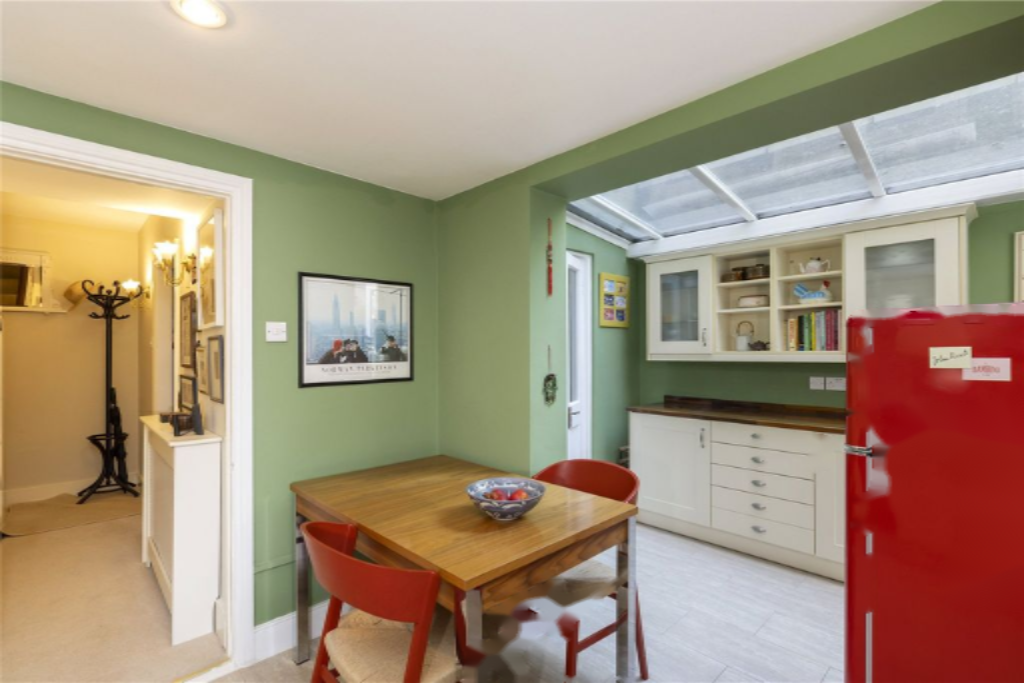 Вход осуществляется с уровня нижнего этажа через собственную дверь, имеется вход и кладовая. Гостиная расположена на южной стороне с двойными дверями, ведущими в столовую, а затем в просторную кухню на задней части недвижимости. Кухня имеет небольшую зимнюю пристройку и выход в сад. От зоны столовой идет лестница на приподнятый этаж с двойной спальней на задней части, семейной ванной комнатой и просторной главной спальней впереди с ванной комнатой с душем.