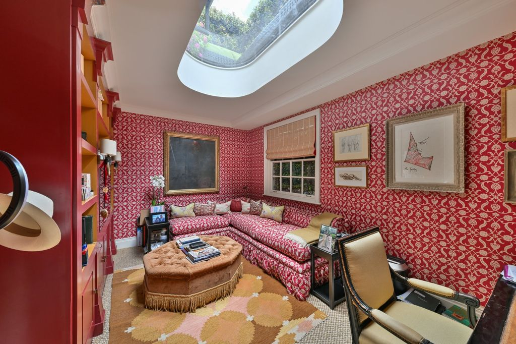 На первом этаже находится идеальная комната, которая может служить как домашний офис или спальня, украшенная великолепной красной тканью от Soane и оснащенная еще одним большим световым люком, обеспечивающим отличное естественное освещение. Здесь также есть аккуратно расположенная туалетная комната.