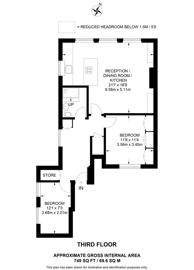 2 beds, 1 bath, 1 reception, 749 sq. ft