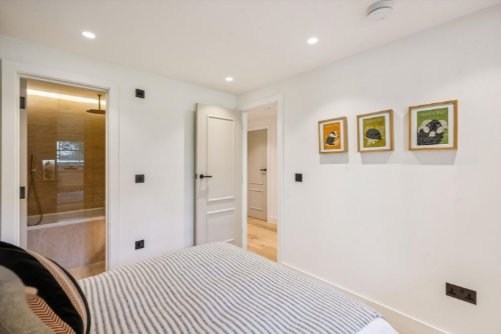 На втором этаже расположены еще две спальни, включая большую главную спальню с видом на сад, гардеробной зоной и собственной душевой комнатой. Другая спальня также имеет душевую комнату и доступ к общей балкону.