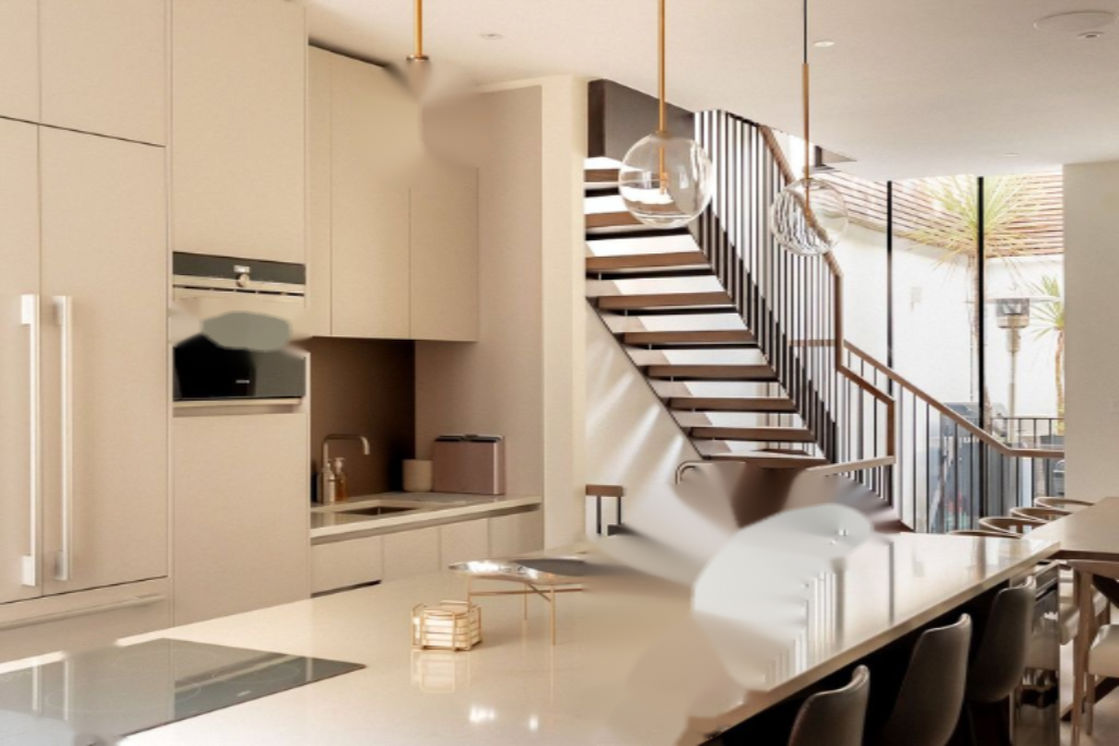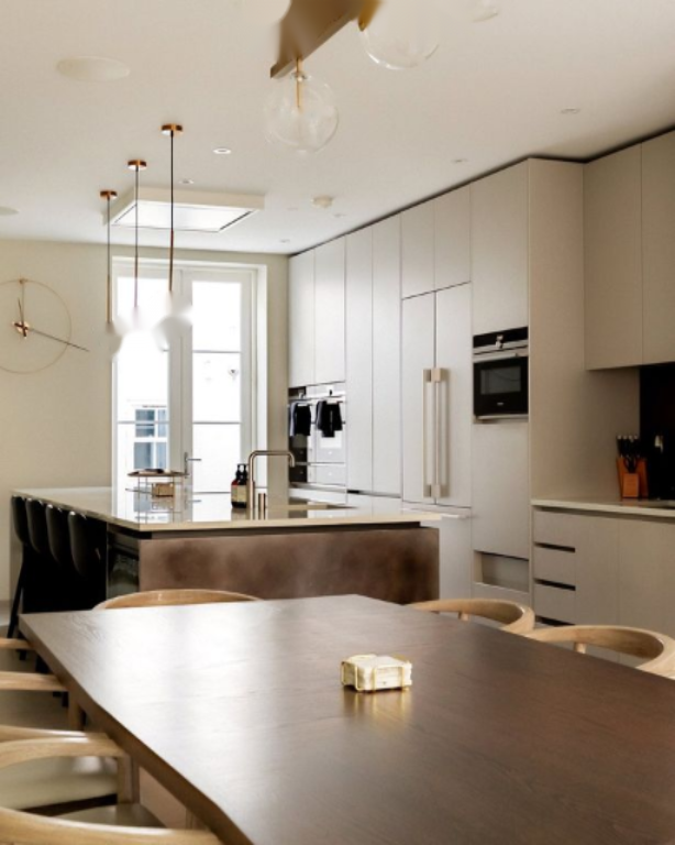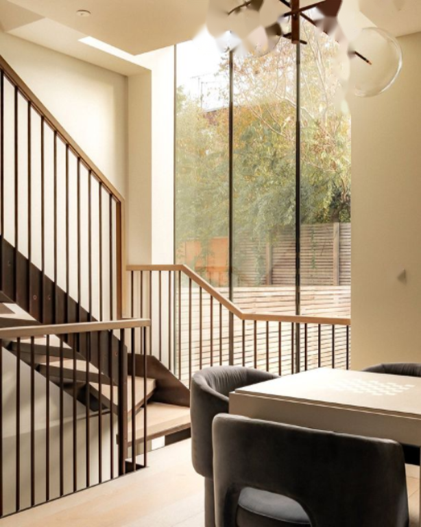 На цокольном этаже расположена кухня открытого плана с центральным островом, просторной обеденной зоной, гостевым туалетом и прачечной. Панорамные окна наполняют пространство светом, а большая дверь ведет в сад.