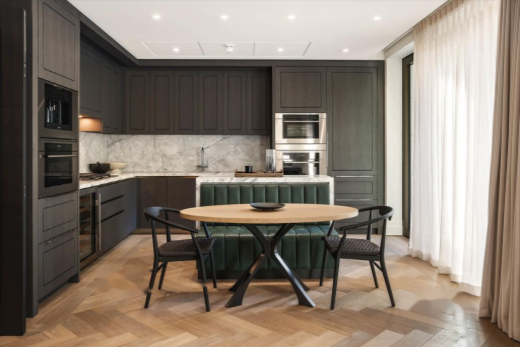Полы из британского дуба в елочку и высокие потолки создают персональное пространство, подготовленное для современной жизни. Панорамные окна обеспечивают естественное освещение элегантной кухни и гостиной. Индивидуальная кухня, ручной работы, выполнена из высококачественного натурального камня, где светлое деревянное покрытие подчеркивает темные столярные изделия, а встроенная техника от Sub-Zero и Wolf добавляет функциональности.