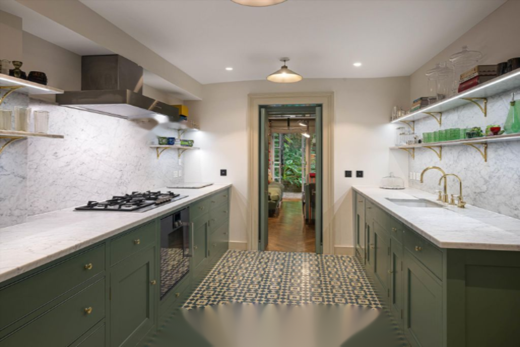 При входе в дом вас встречает элегантный коридор, ведущий в просторный холл. Слева находится изысканная гостиная, а справа столовая и зал для отдыха с видом на сад, подчеркнутыми большим окном в крыше. На нижнем уровне располагается хорошо оборудованная кухня с мраморными столешницами и отдельной кладовой, между подсобкой и семейной столовой.