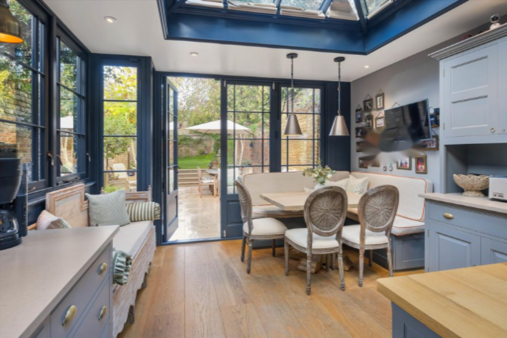 Индивидуальная кухня/столовая в задней части дома светлая и просторная, выходящая в очаровательный сад длиной 100 футов с исторической стеной.