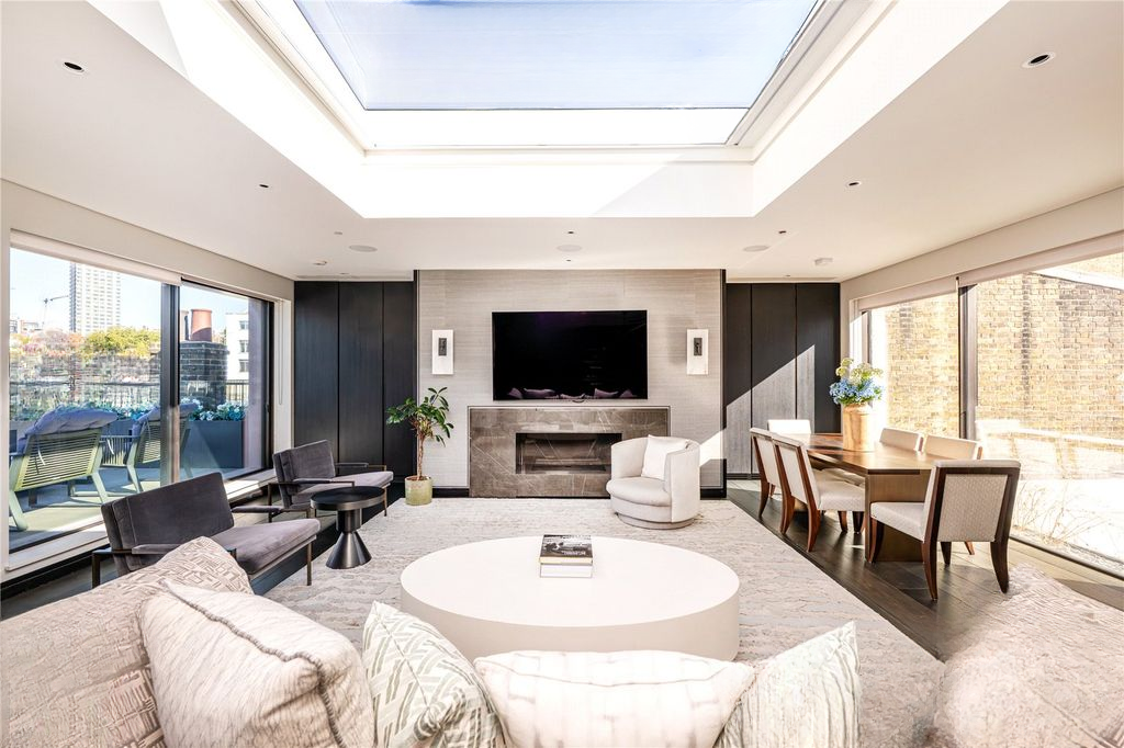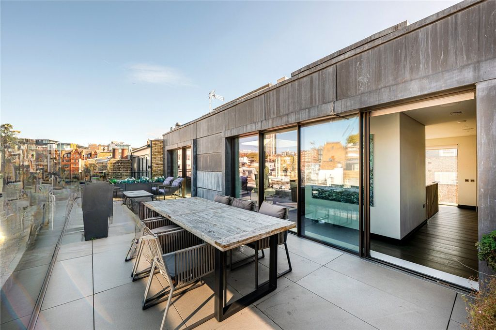 Верхний этаж полностью отведен под просторную кухню и гостиную, где раздвижные двери от пола до потолка и световой люк наполняют помещение естественным светом. Терраса расширяет жилую зону на открытый воздух, создавая идеальные условия для обедов на свежем воздухе на десять гостей или расслабленных вечеров с видом на крыши Найтсбриджа. Впечатляющий мраморный камин с имитацией пламени, авторская мебель и широкая дубовая паркетная доска определяют атмосферу пространства.