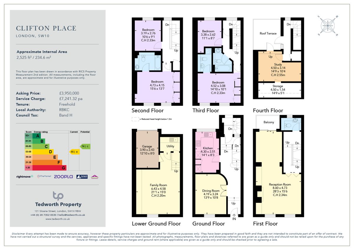 Это современный дом с отличной планировкой, находящийся в признанном и очень престижном районе Болтонс, рядом с известным анклавом "Beach" на Fulham Road. Дом распределен на шести уровнях. На первом этаже находится кухня и отдельная столовая; книзу расположен полезный склад или универсальная семейная комната с доступом в встроенный гараж. Просторная двойная гостиная занимает первый этаж, на втором этаже расположена основная спальня и вторая, меньшая, спальня. На третьем этаже находятся две спальни, одна из которых с собственным санузлом, и дополнительная ванная комната, доступная с лестничной площадки. Четвертый уровень можно использовать как пятую спальню, хотя в настоящее время он используется как кабинет, с прямым выходом на террасу, выходящую на юго-запад.
