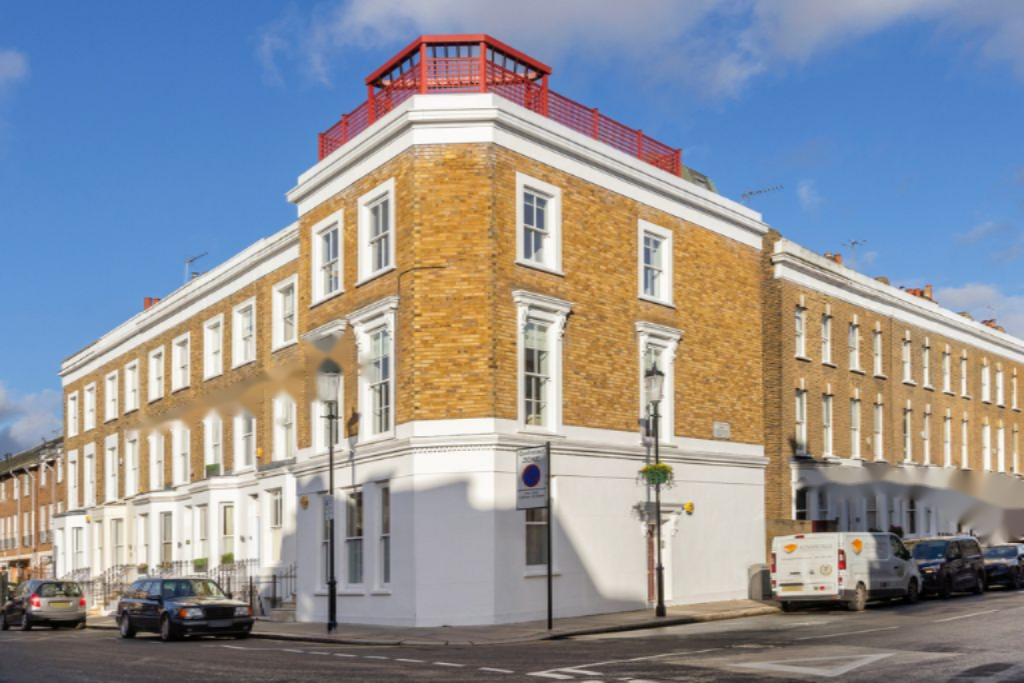 Уникальный угловой дом в центре Челси с впечатляющей гостиной двойной высоты и мезонином, четырьмя-пятью спальнями и большой террасой на крыше.